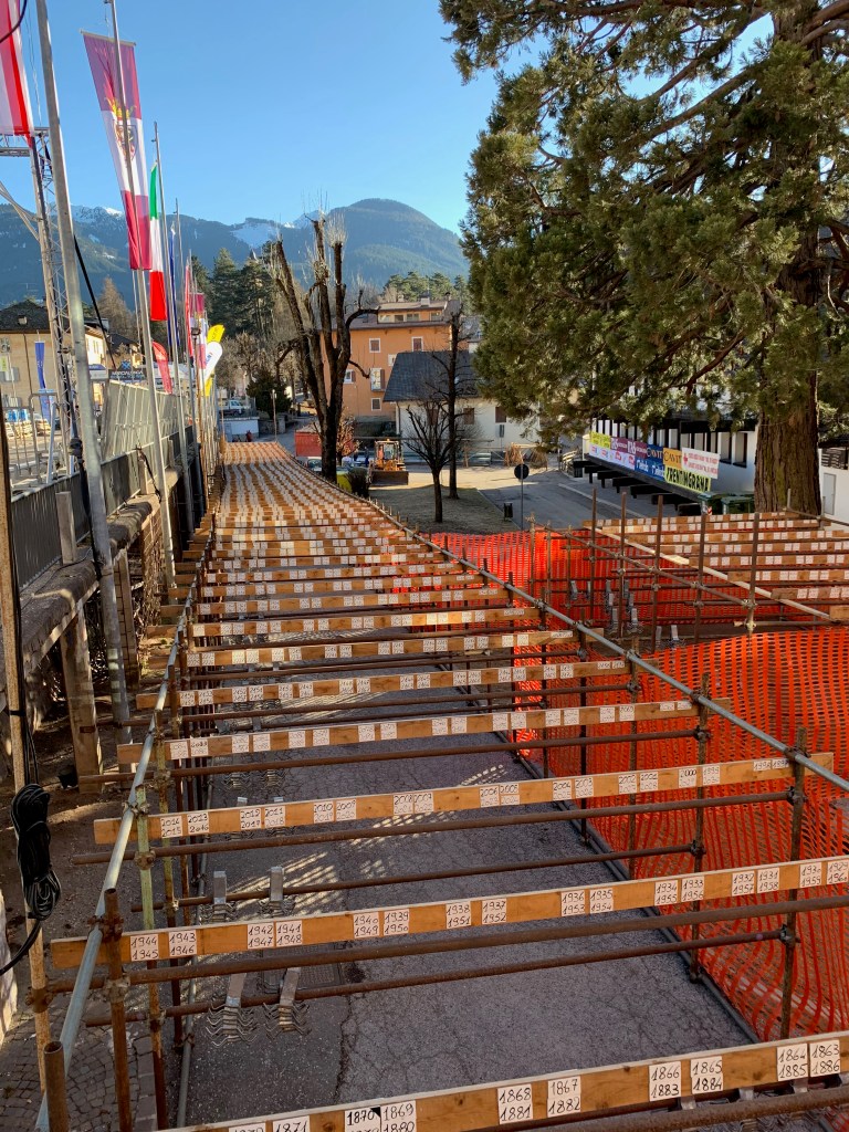 After skiing we went to pick up our race kits for the Marcialonga. The bib pick up and the finish are both in Cavalese. Here is a picture of the finish area- notice that there is absolutely no snow. They will truck man-made snow in by the dump truck full through the whole town! They call it snow farming and actually the whole course of 70 km is on an artificial snow track!