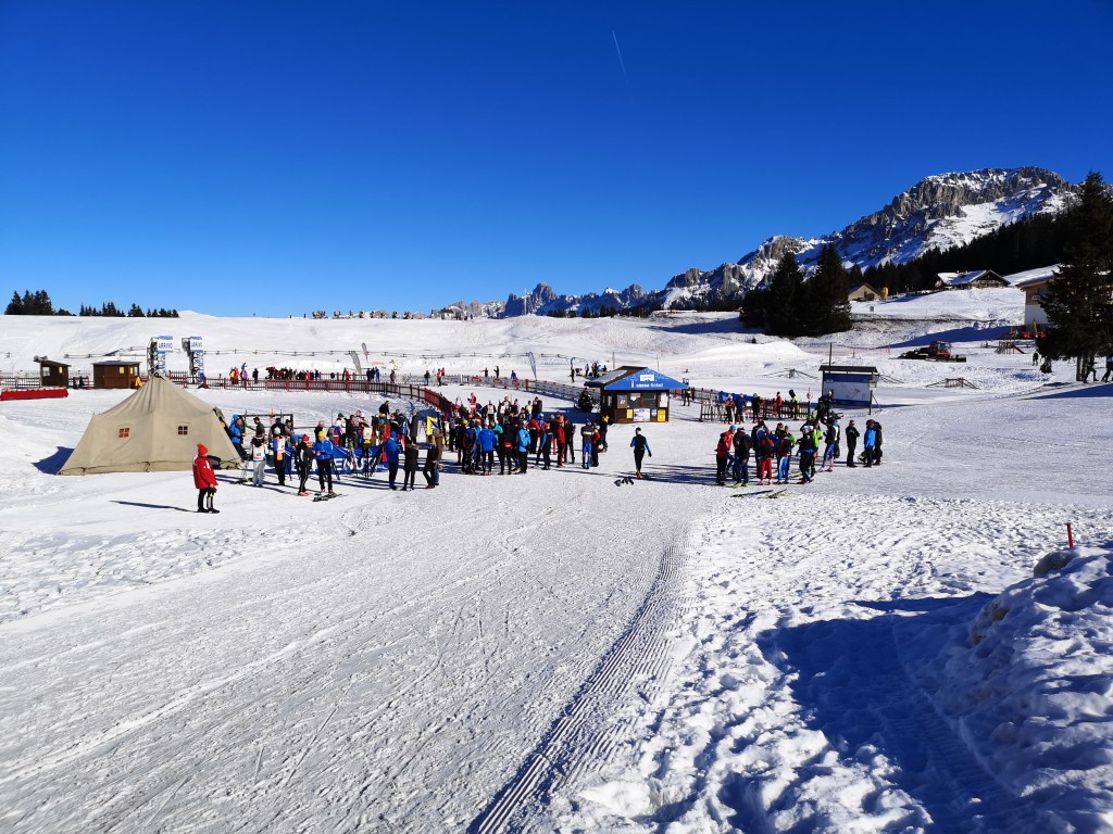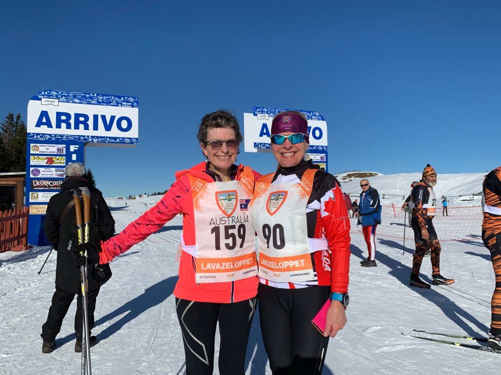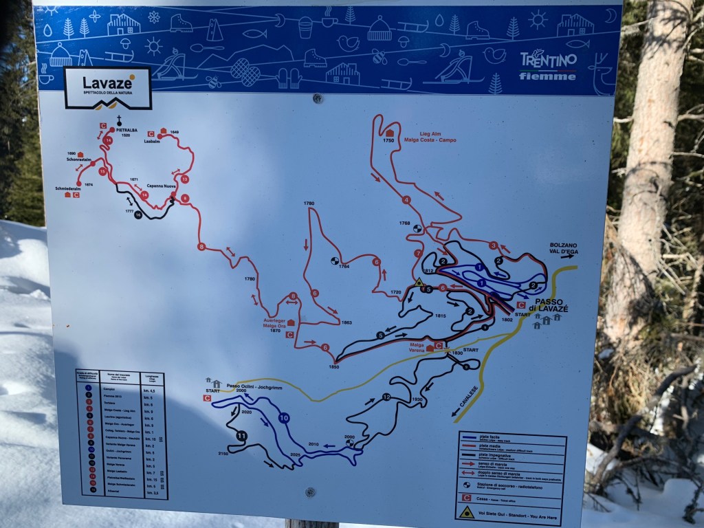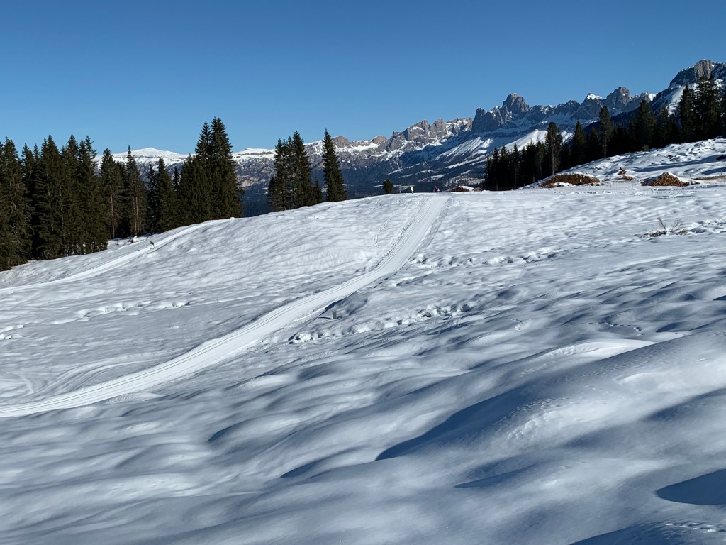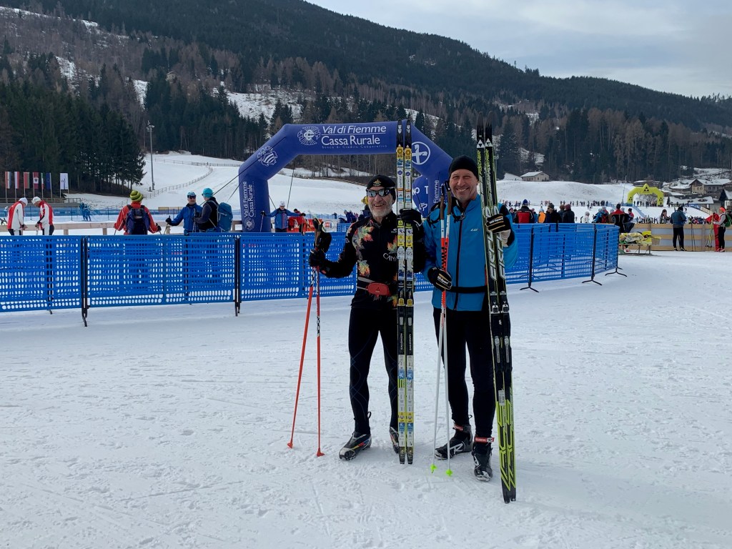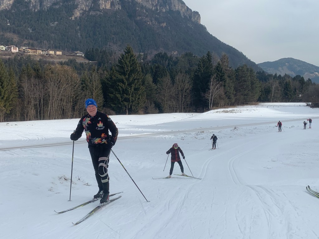 We woke up to a gorgeous, bright, sunny day with a temperature of about -4 at the pass and 0 degrees at our apartment. There is no snow on the ground in Carano but some on the mountain tops in the distance. Hard to believe that we are actually going to be able to cross country ski at all. The four of us headed up to the Passo Lavaze and I was so shocked to see the trail system and the number of cross country skiers on the plateau at between 1600m to 1880m. There are bars/ristorants/hotels and lodges. The skiing was unbelievable and we covered about 16 km of rolling terrain with spectacular views. The “apocalyptic” windstorm of 2018 has blown down an incredible number of the trees so the jagged mountain tops are in plain view. After our ski we picked up our race bibs for the 43 rd edition of the Lavazeloppet which is a short Worldloppet short course of 22 km being held tomorrow morning. It’ll be a great first race- we’re excited!!!