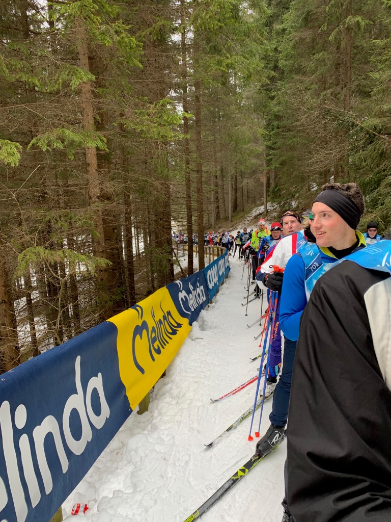 Even though it was mostly downhill from Cavalese the few uphills on the course were very slow moving.A Line up that brought back memories from the Vasaloppet last winter. A nice rest though!