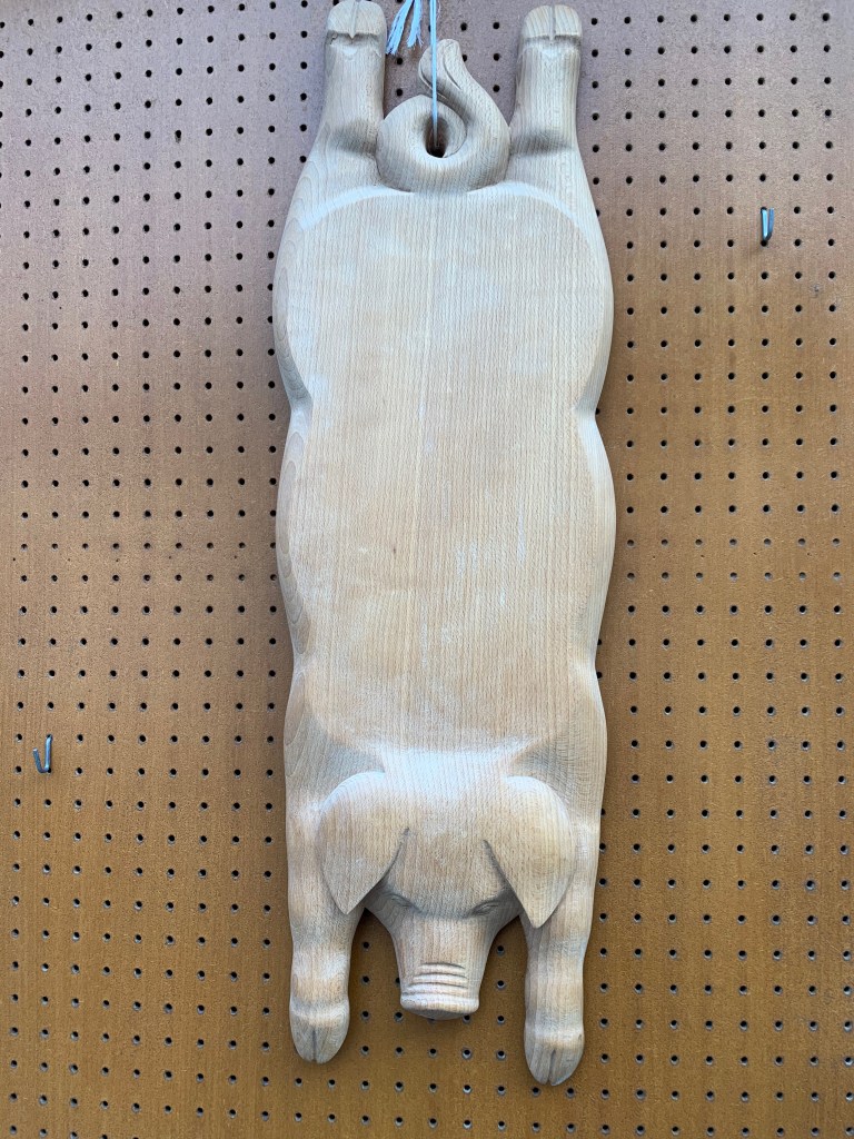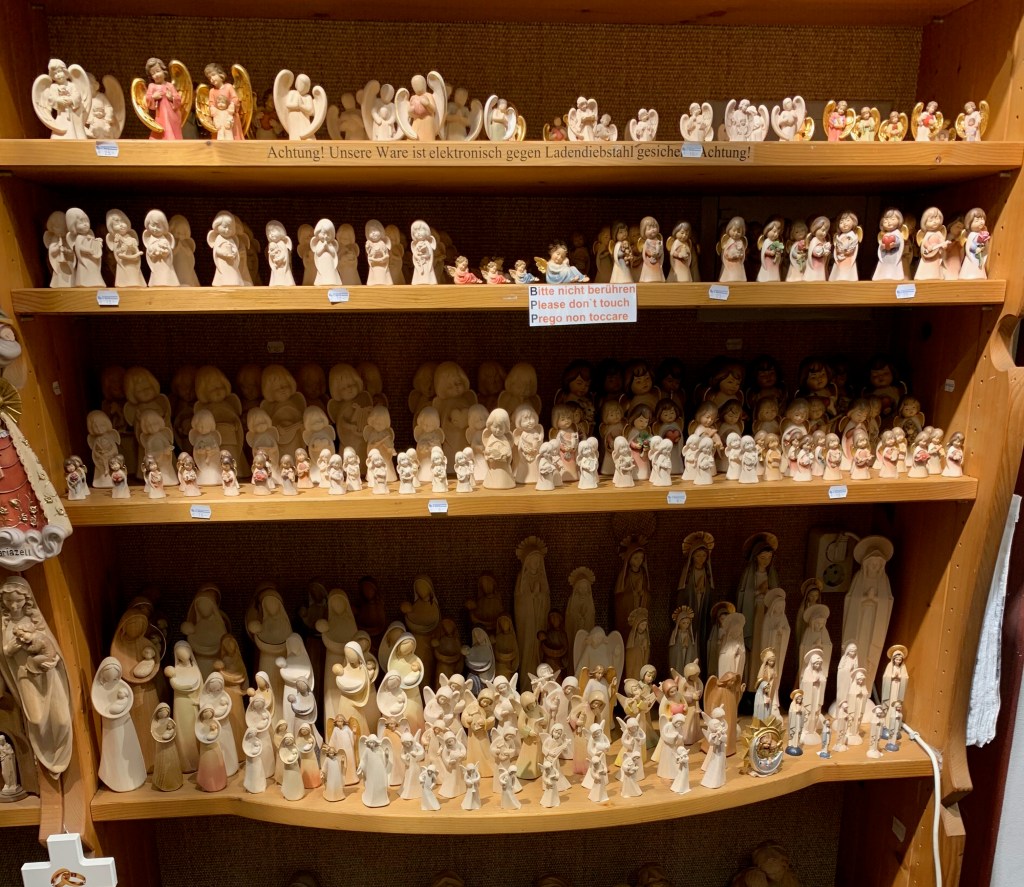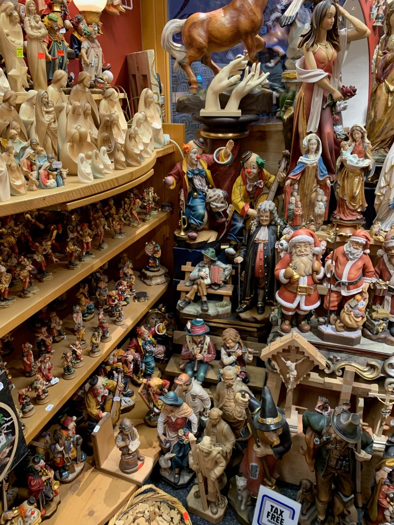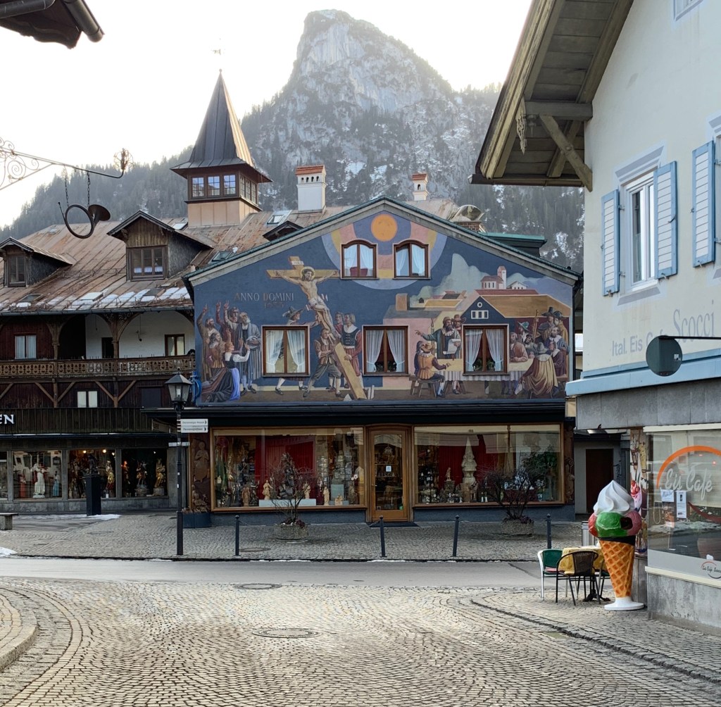 Oberammergau is known for it’s wood carving and painted houses. There are so many wood carving shops with shelves lined with hundreds of carvings, mostly religious. This schwein cutting board caught our eye and we bought a beautiful linden wood bird carving to bring home.