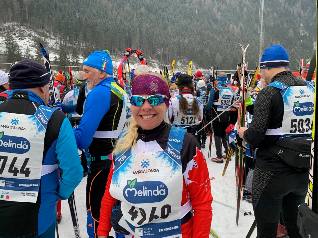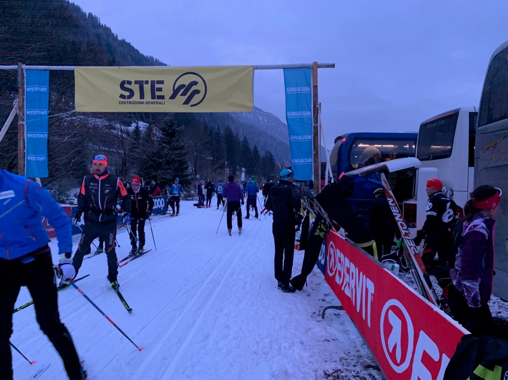 Well the big day is finally here! We all woke up at 4:30 am to eat a good breakfast and to walk down to the bus stop for 6:15 am. The coach bus took us to the start area in Moena. It was still quite dark when we arrived so next time we’ll bring a headlamp to the start of every race. We were able to do a last minute ski test on the actual track. We have both decided to race on wax skis. They seemed fast and the track was pretty solid. Ross put several layers of klister covered with a hard red Toko wax. I am so thankful that Ross does my skis and he’s so so good at it!