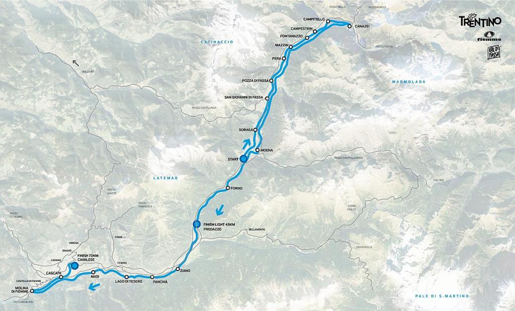 The race starts from the “plain” of Moena at an altitude of 1,150 metres above sea level and is 70 km long. Then it goes up the Fassa valley to Canazei and back down past Moena and Predazzo to Molina di Fiemme, finishing in Cavalese.