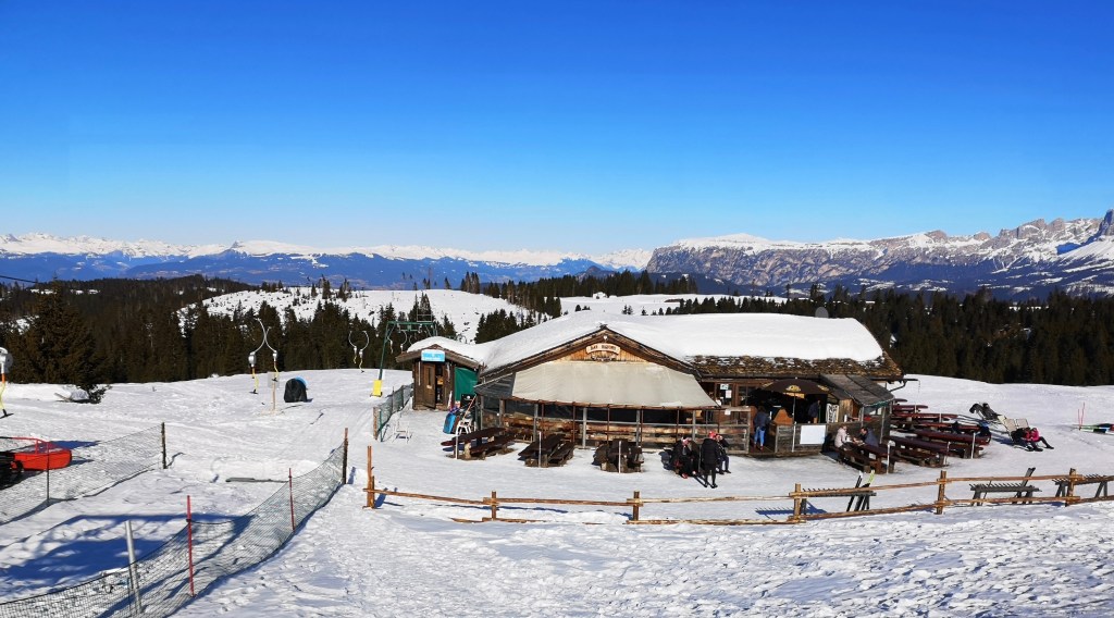 Today we headed up the road for 13 km to the pass for a classic ski. A big part of the drive is 18% grade. It sure would be a tough bike ride up and a crazy downhill. Once again it was a clear sunny day with a wind of 2 m/s. We met a fellow Canadian from Canmore who was also here for the Marcialonga. After our lovely ski we had a traditional ham and cheese panini at the bar.