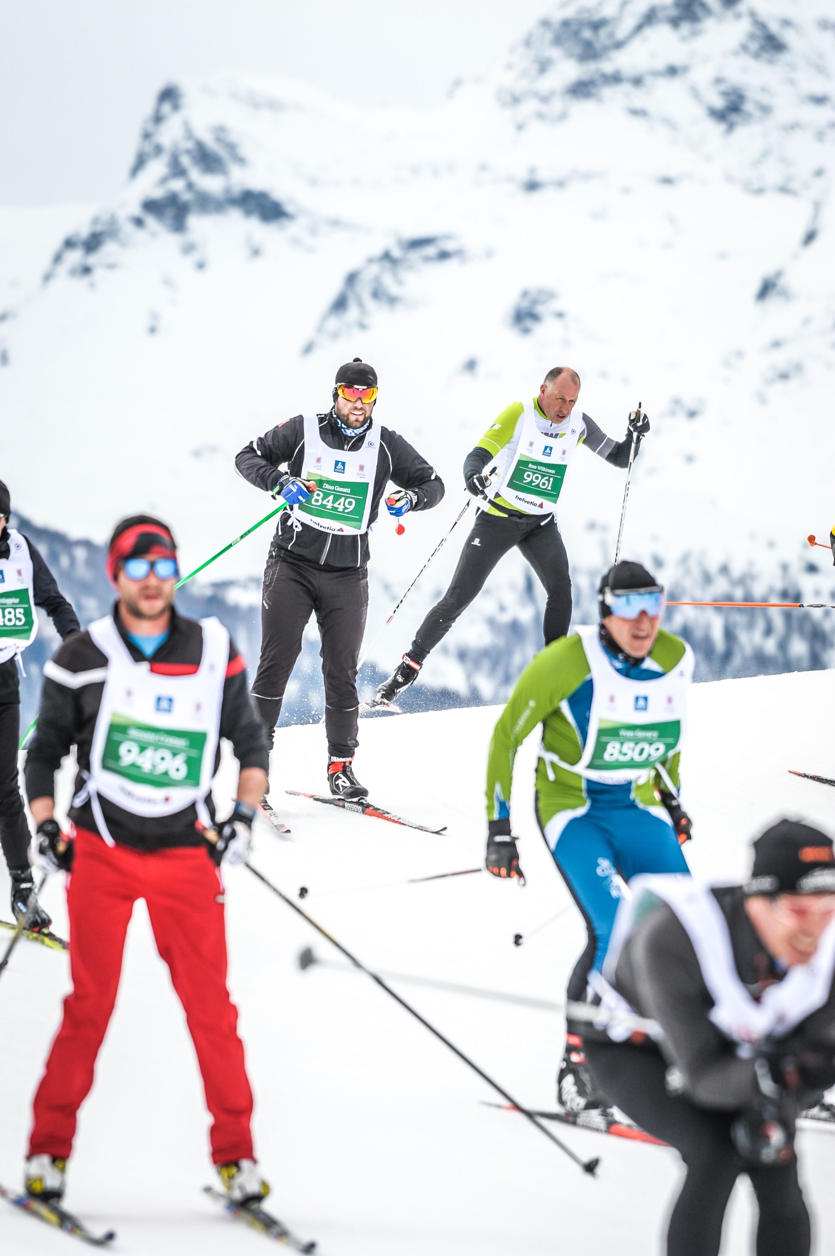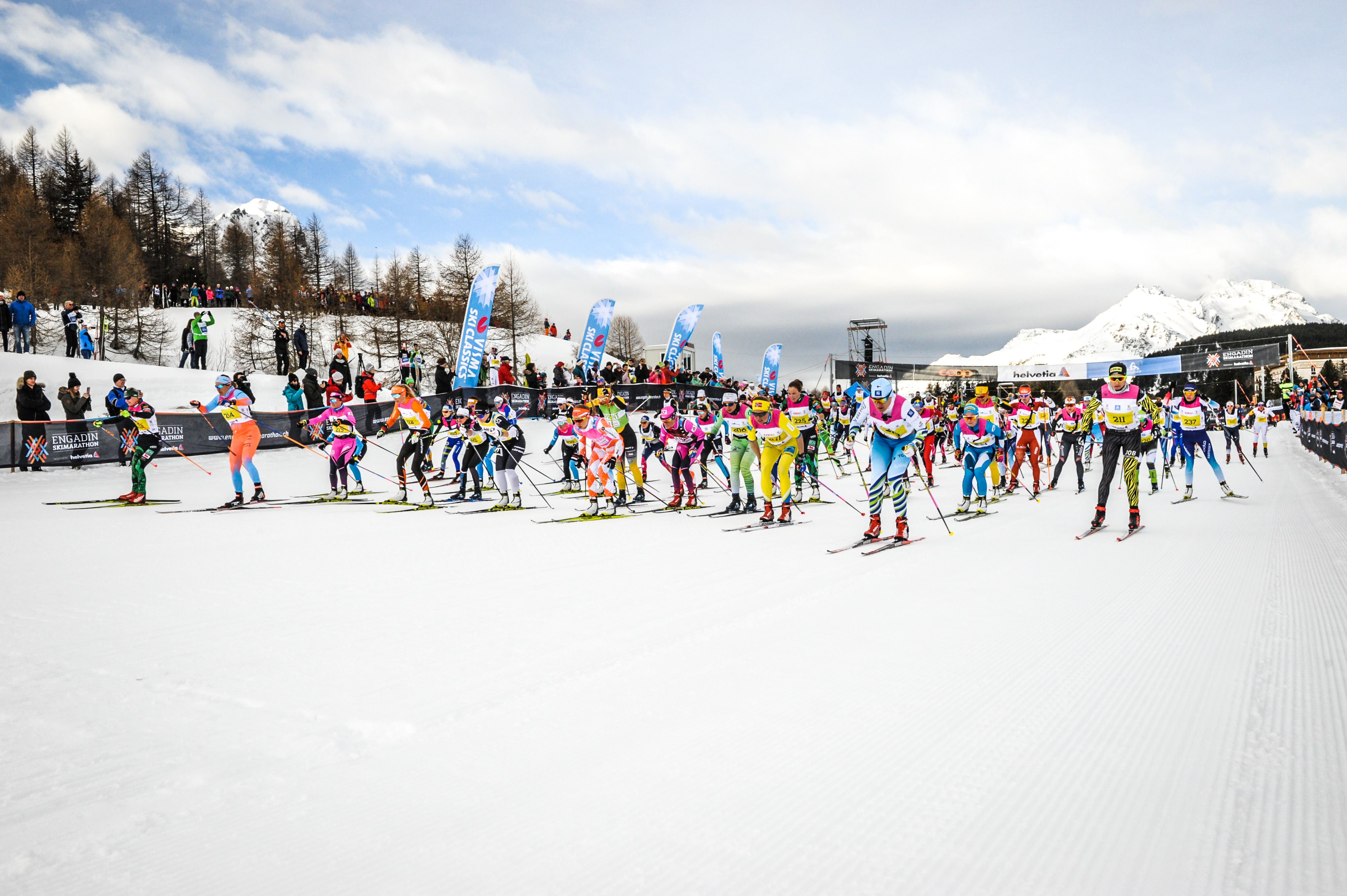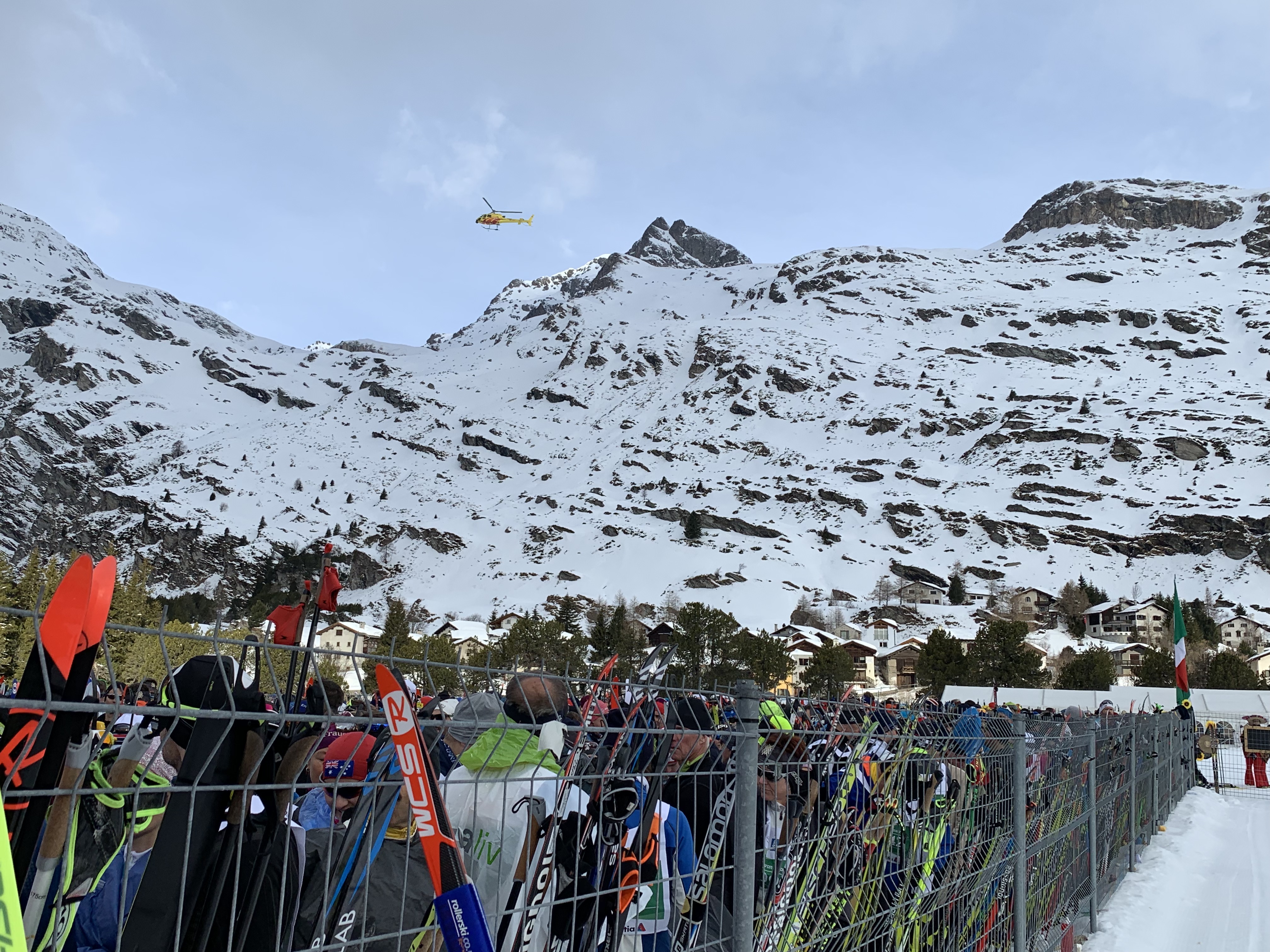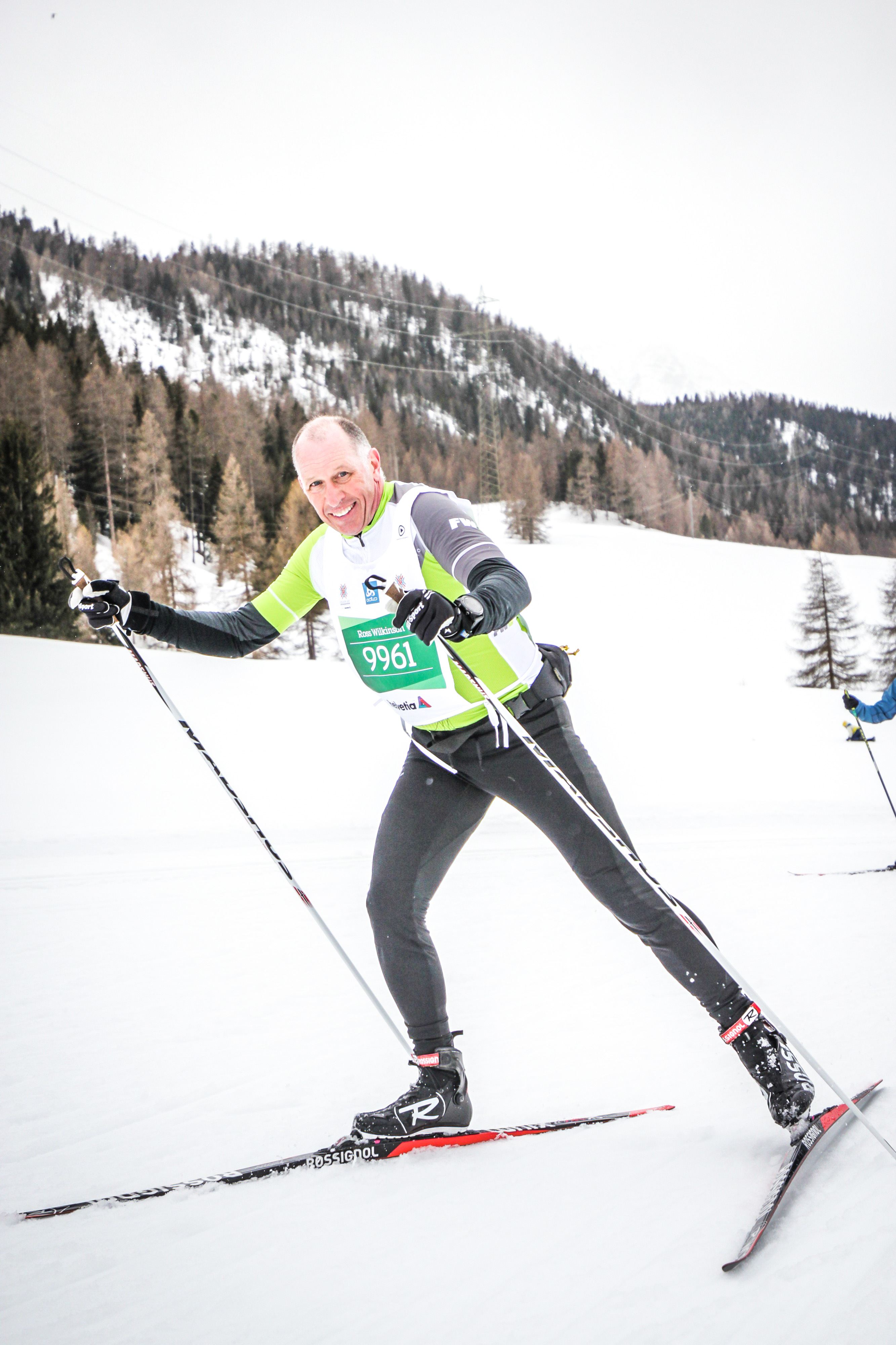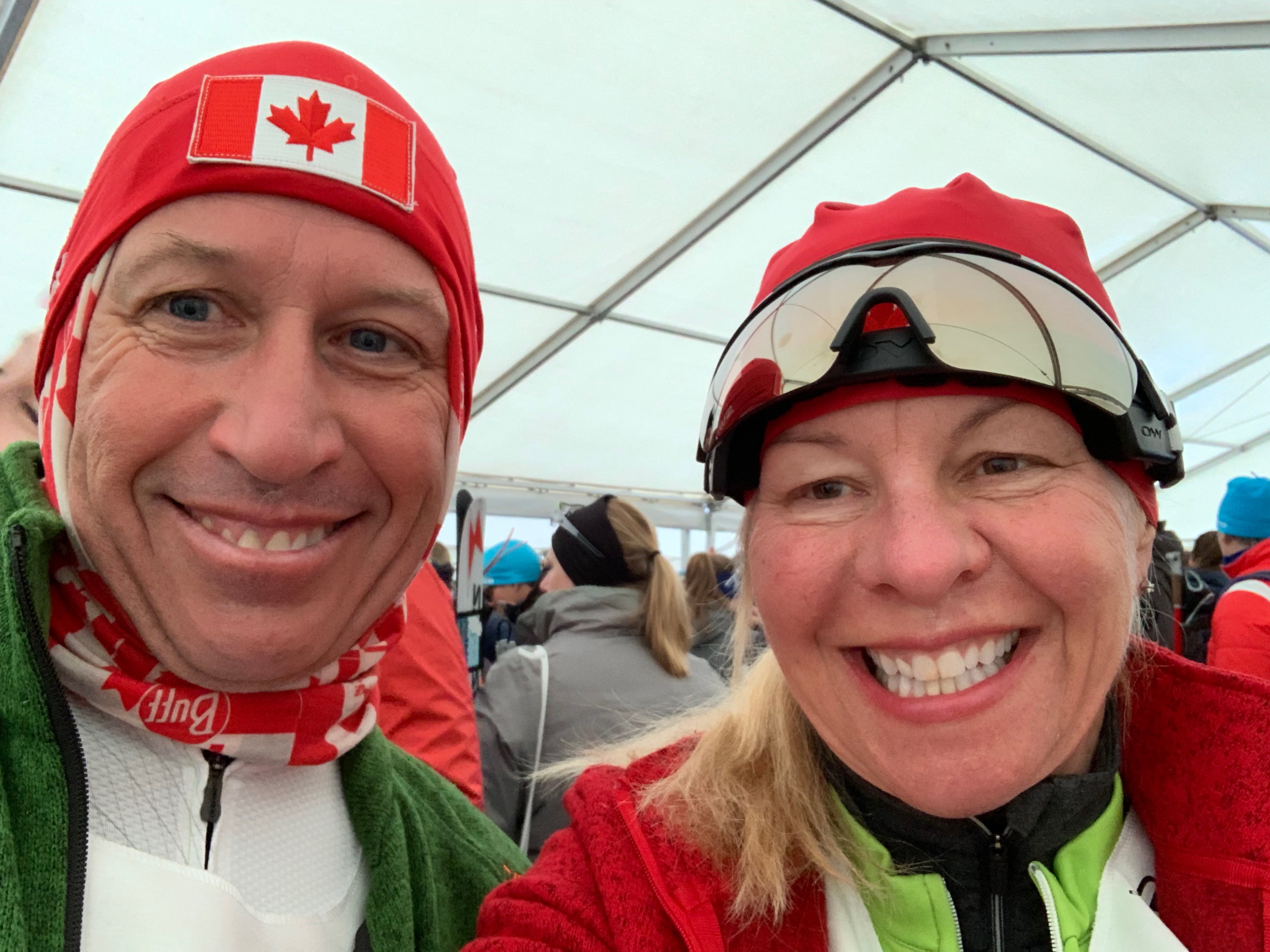 It was a perfect race day! The weather was beautiful- a mix of sun and cloud and temperatures about -2 at the start warming up to about plus 3 or 4 degrees! The scenery was spectacular and the vibe everywhere was electric! The elevation of the start was 1800m and the finish was at 1600m so a net downhill. We dressed with only 2 thin layers and ended up wearing a thin hat(Ross) and a headband(me). This was a big change for us since it’s been such a cold winter at home and we’ve been use to wearing so many layers, neck warmers and even boot covers.