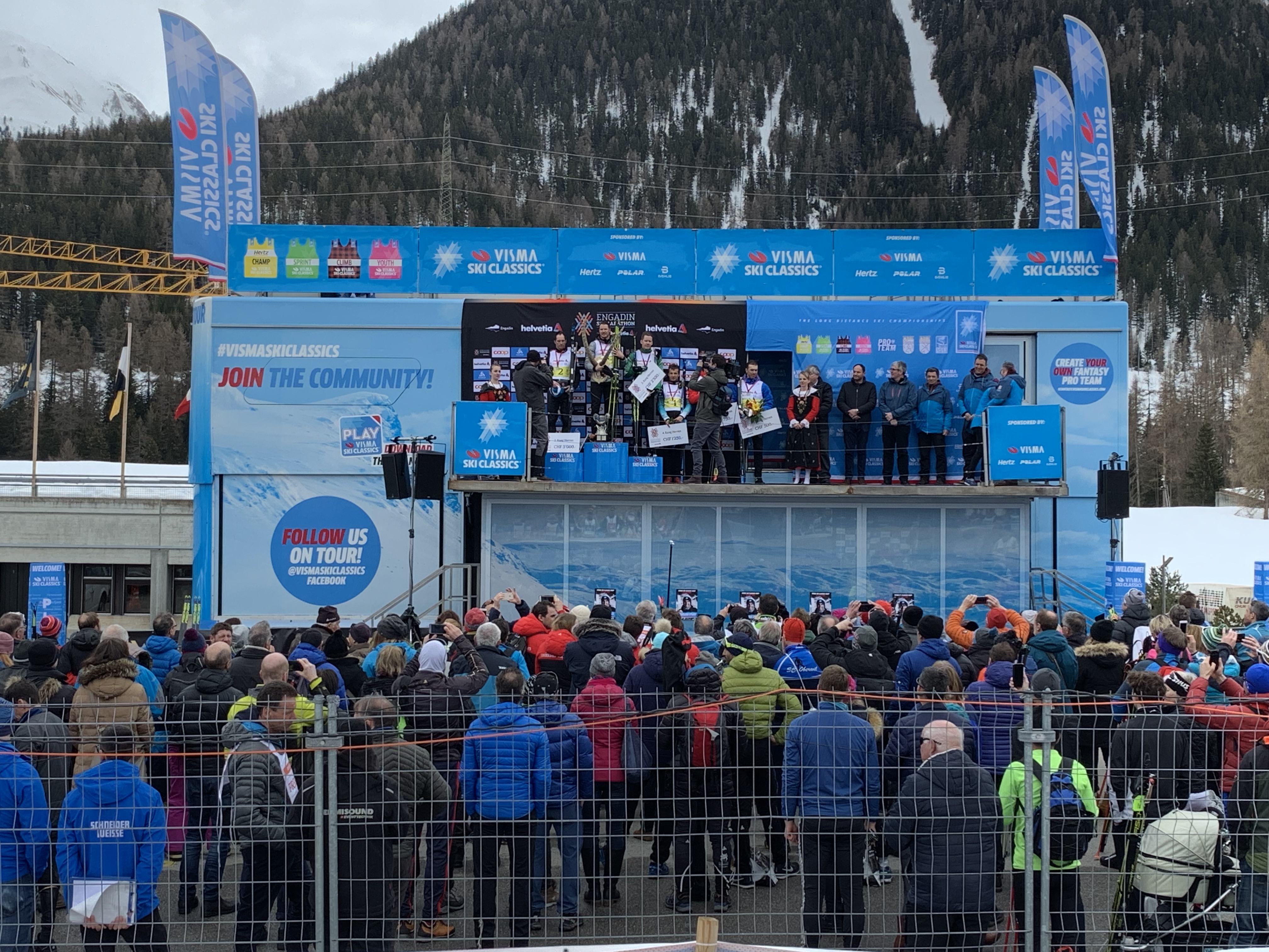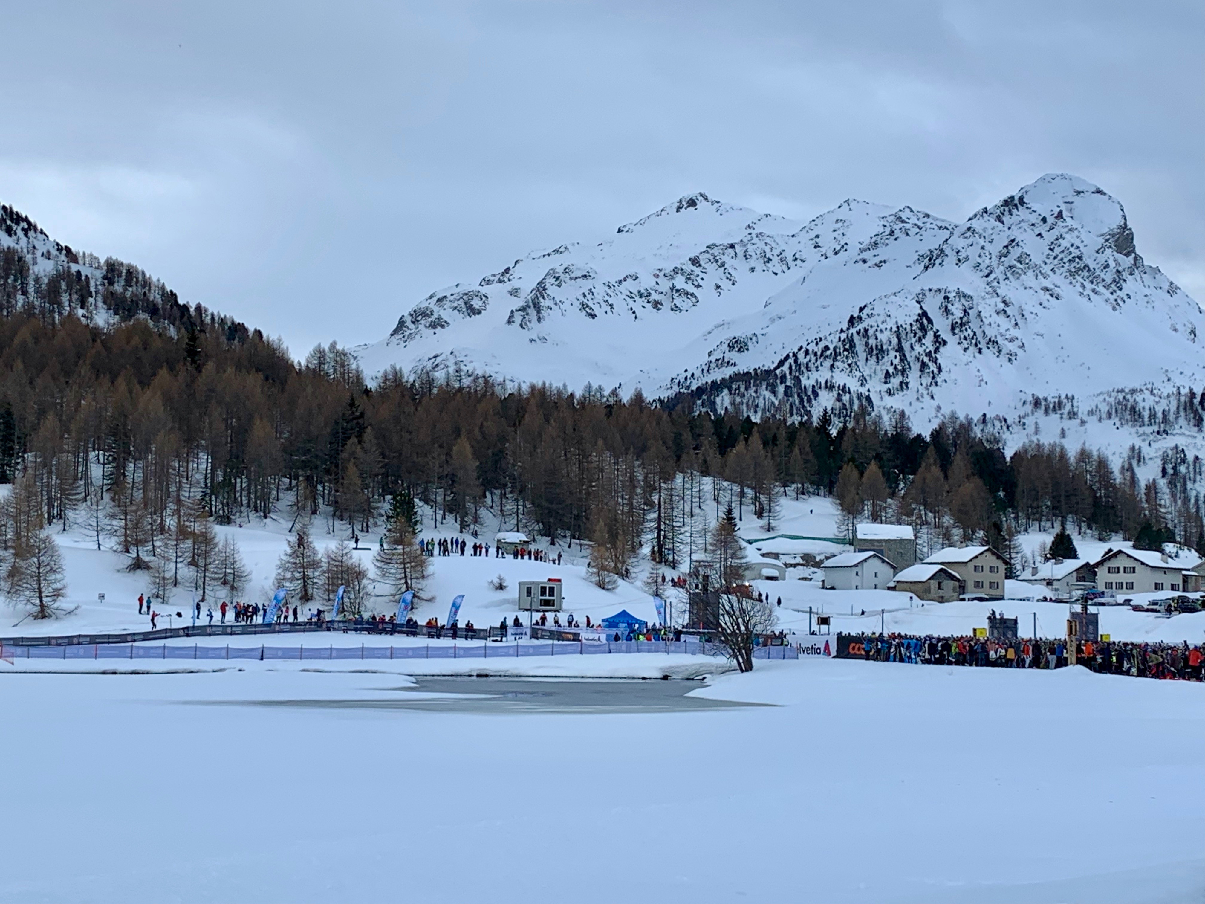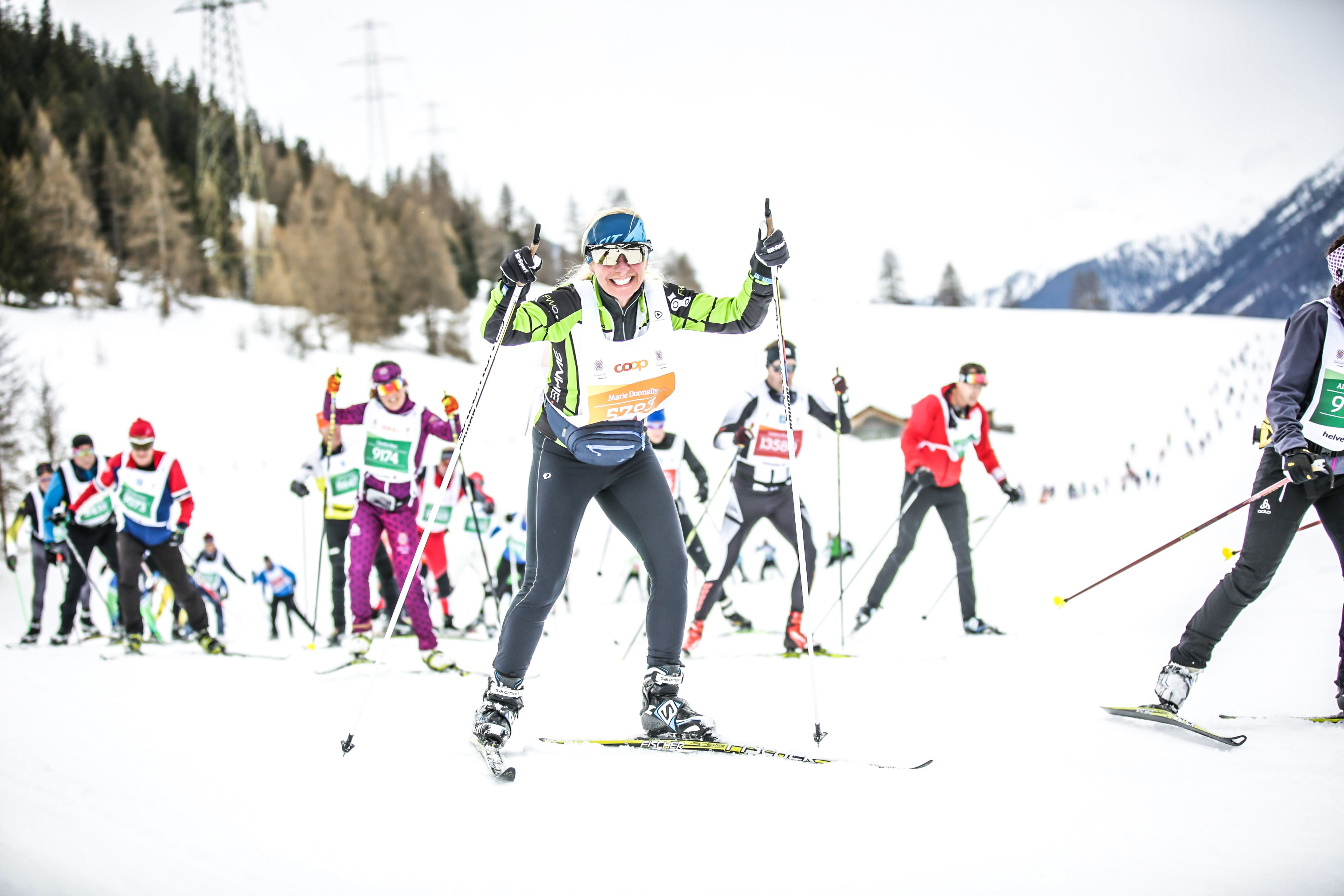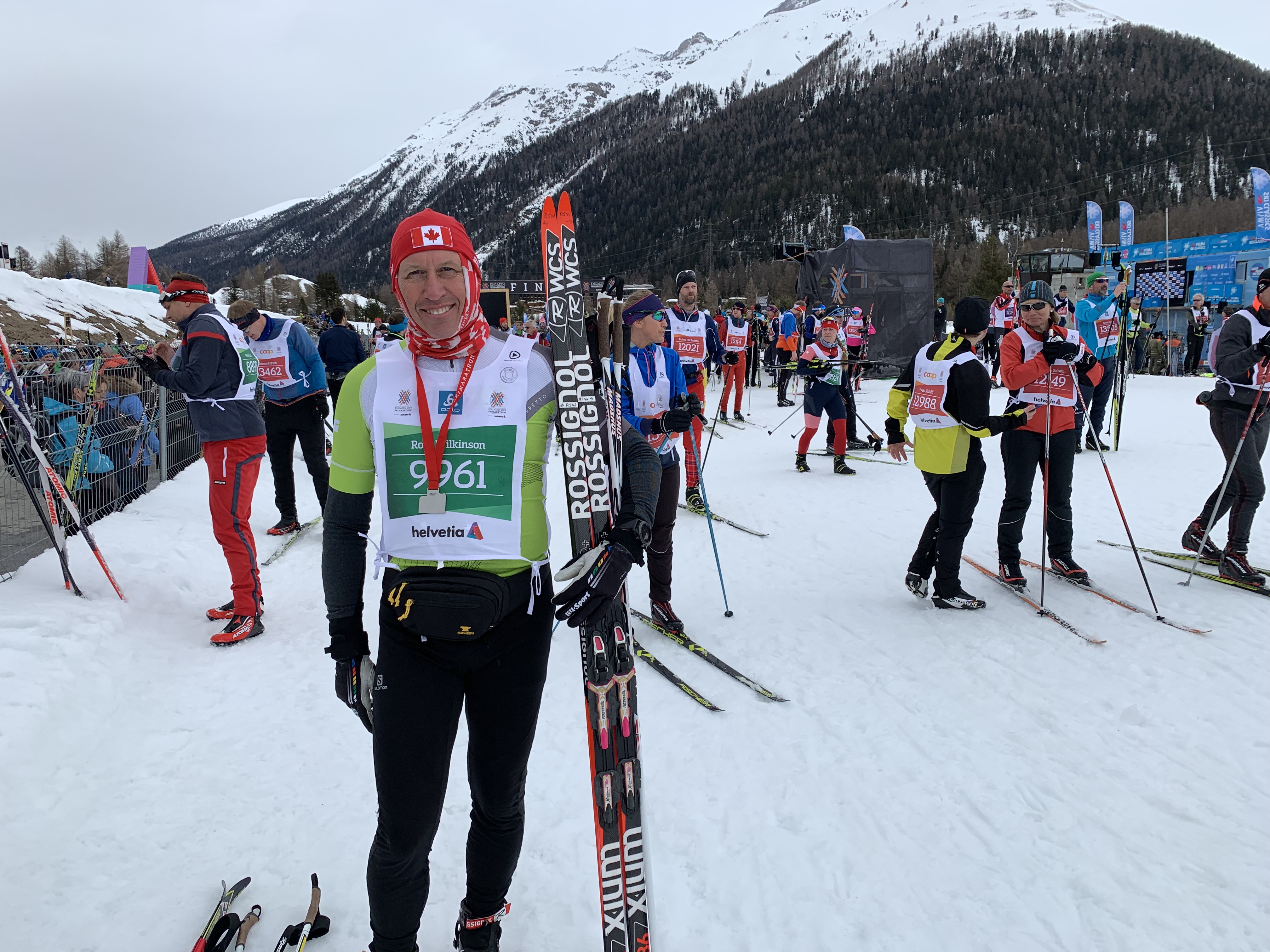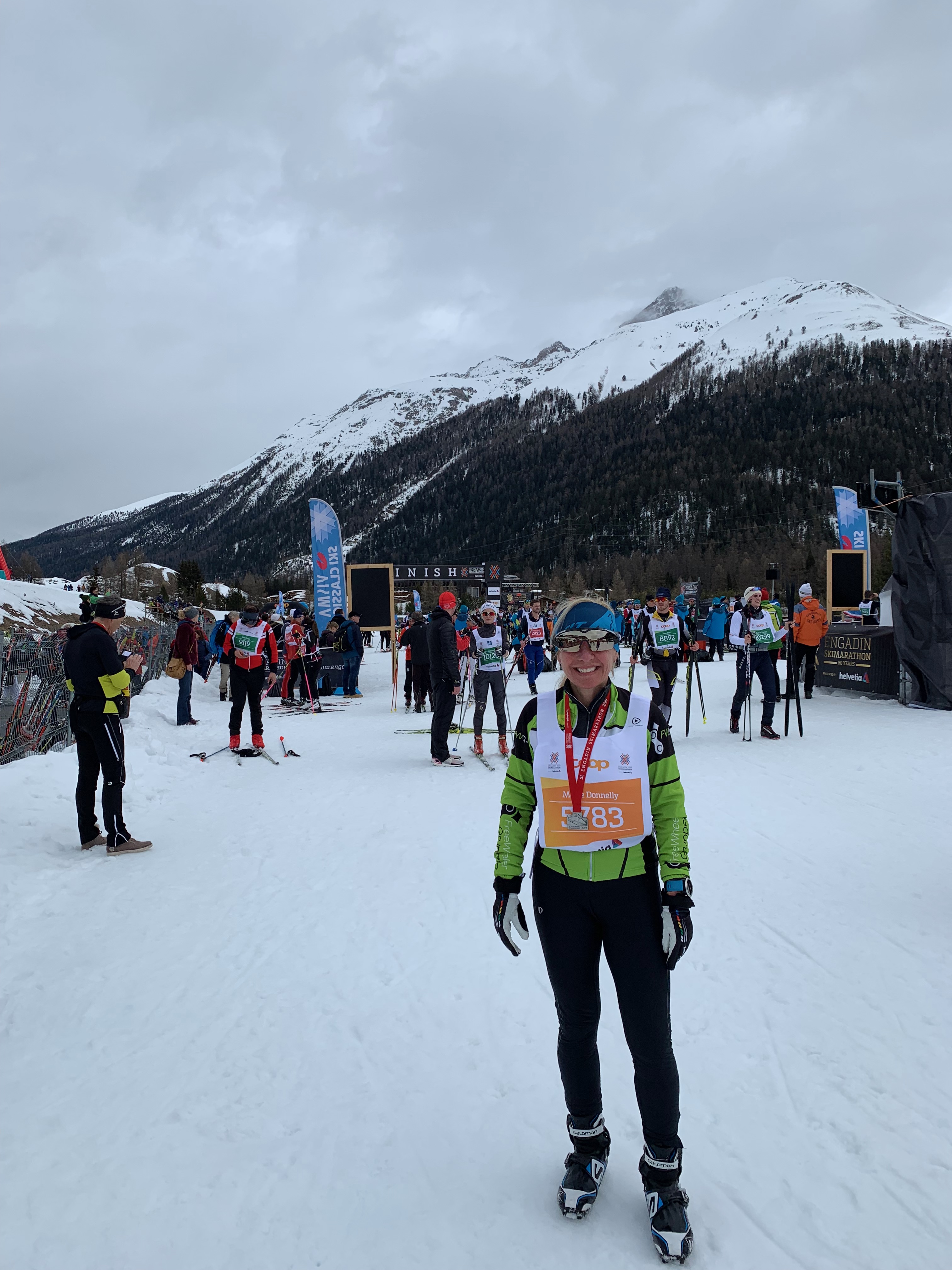 The sun was shining at the start and the track was very fast! It was busy but not too bad until the hill just outside St. Moritz where I saw a flash of the famous hill of the Vasaloppet. However,there was even a volunteer organizing us into 3 lines across. It moved pretty well and was a short climb. I did have time to eat half a bar waiting in line to go up!The famous downhill slalom course through the trees was much easier in the daylight so it was very fast and I stayed upright! We skied through several towns along the journey where the trail was lined with people cheering, ringing bells and yelling Uppa, Uppa and Heja, Heja! The wind was even at our back! It was just perfect! I felt pretty fast and stopped twice- at Pontresina(20 Km) and Bever (30km) for a bar, mango and water. I starting feeling excited that I’d probably beat my goal of under 3:30. With about 7 kms to go I still hadn’t seen Ross and was getting worried. The snow was very soft as I approached S-Chanf and I could hear the cheering and announcing! I was 500m from the finish and so so happy! What a spectacular finish area. There were so many people cheering, held back by the same fencing as the pens and little Swiss children putting the medals on- so cute! I didn’t see Ross but finally we met up at the finish- both so happy with our results. I had even finished in time to see the winners presentation which doesn’t happen very often. Ross finished in 2:20 and I finished in 2:54!! I was 47th in my age group out of 170 and Ross was 269th out of about 900. We felt great!