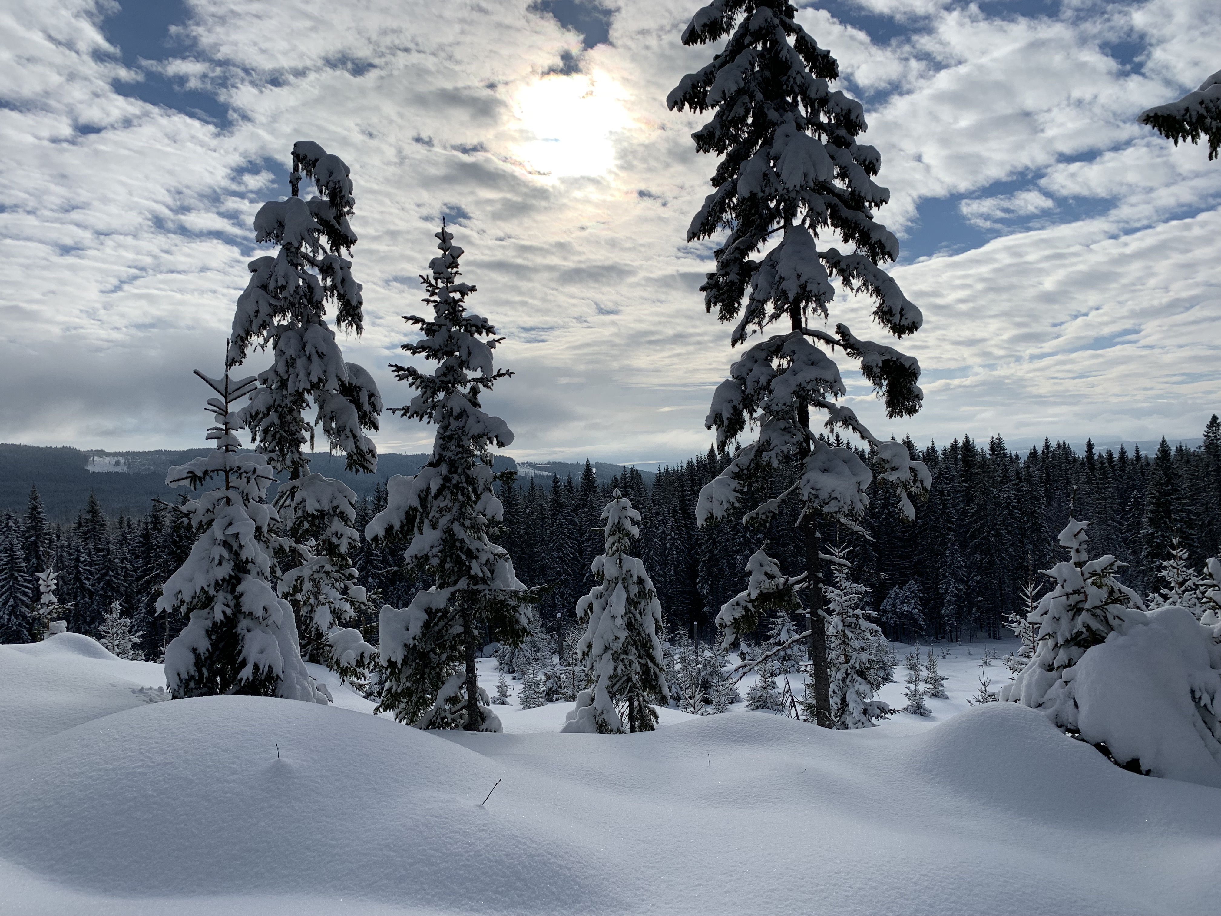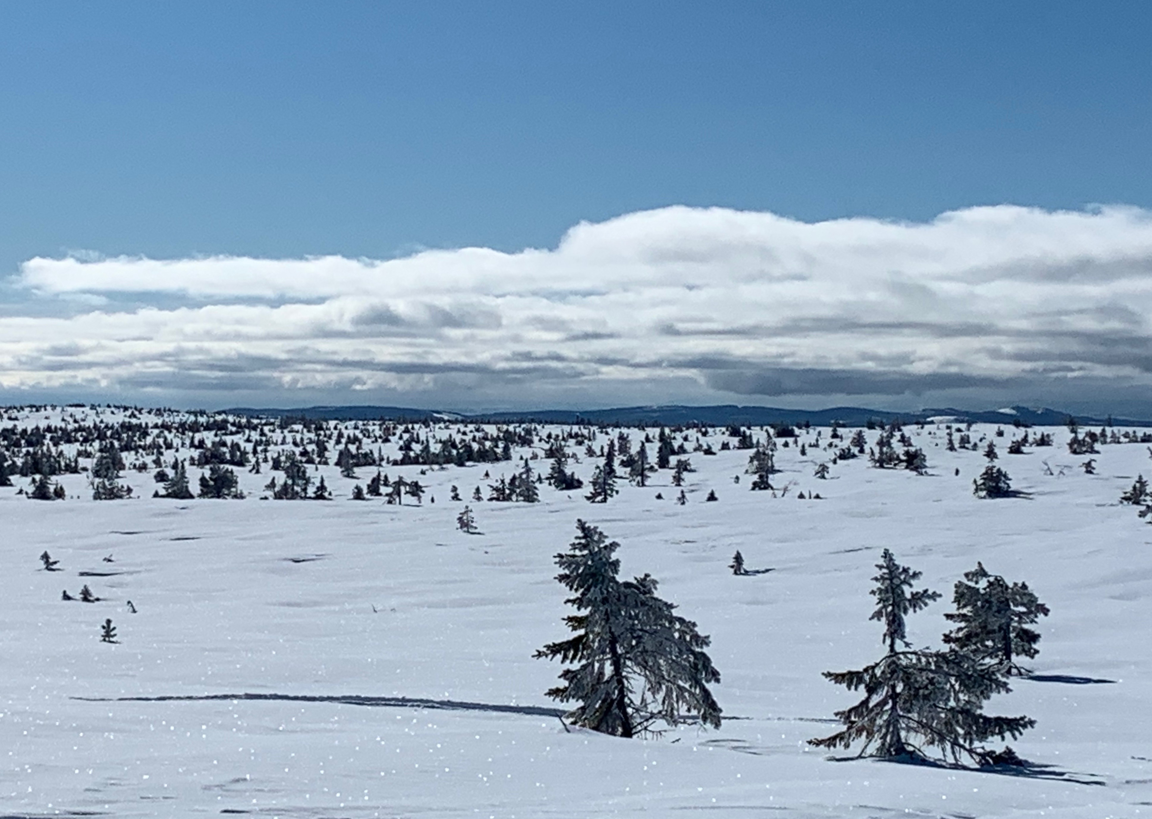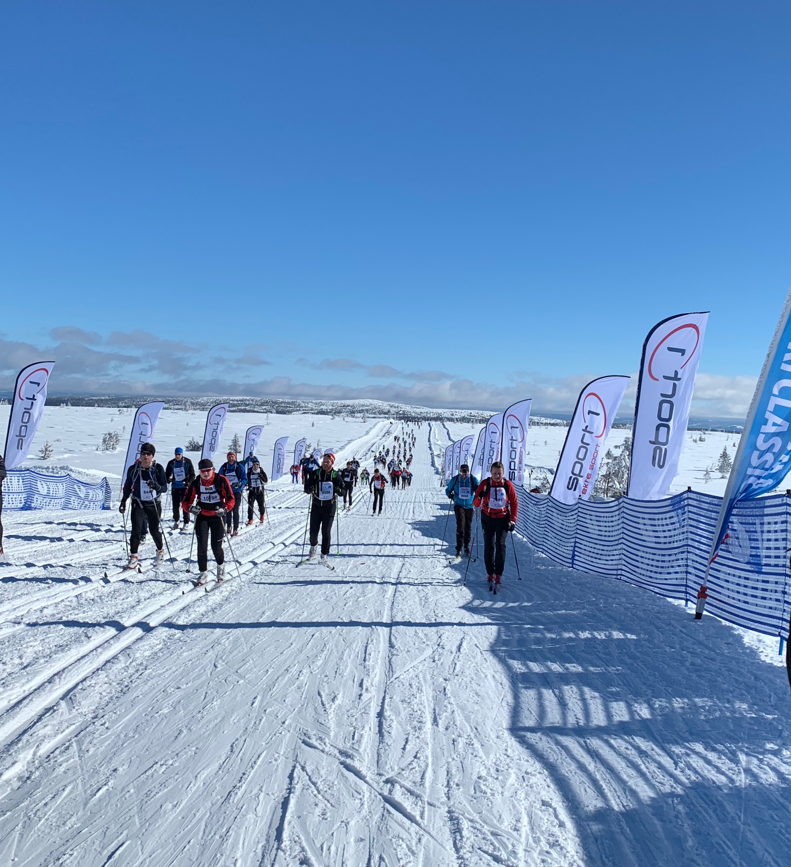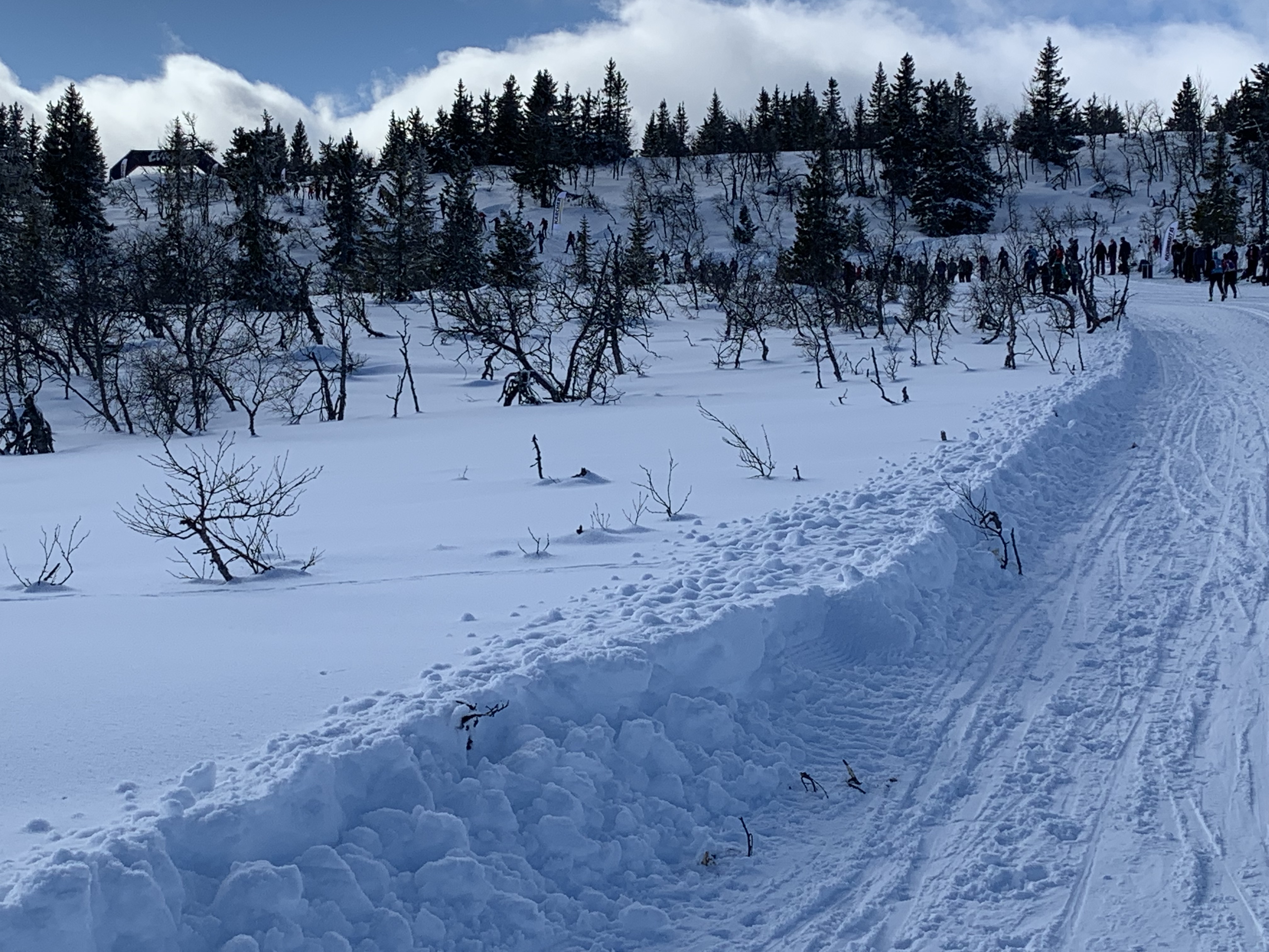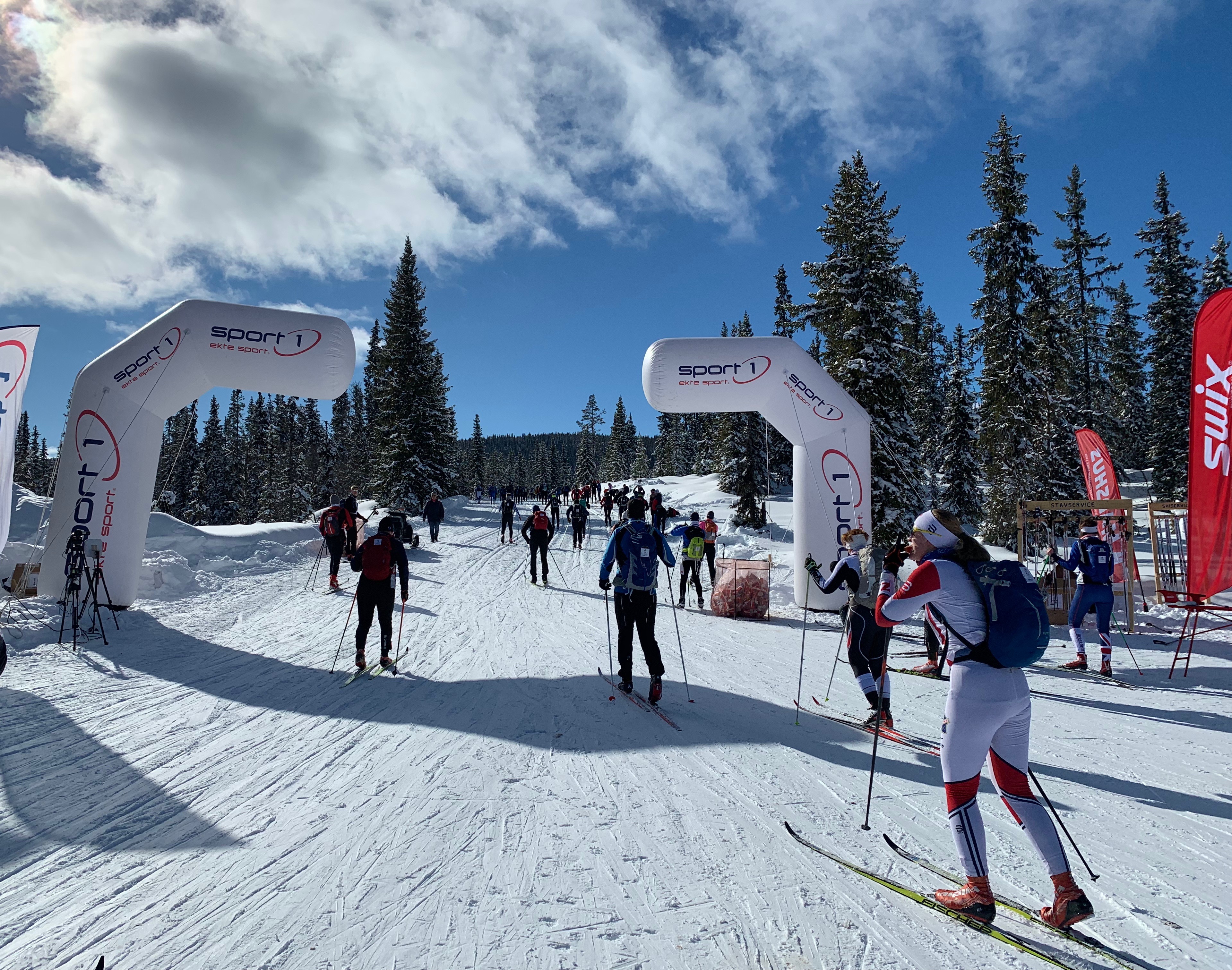 The start area was very large with skiers everywhere you looked, white tents, warming fires with fur covered hay bails and lots of flags. The start was very organized and you were able to put your skis on 15 minutes before the start, which was really nice. The gun went off for each wave and within a few hundred metres we started up what would be about a 20 km steady climb. I didn’t have the best grip which made it very tiring and I knew that I was definitely not skiing on fresh legs after doing the last 4 Loppets. Luckily at about 6 km there were bright red Swix flags waving in the breeze so I pulled up to them and they took off my skis and hot waxed them with some more V45 grip wax. The guy was so nice! He even cleaned under my boots, did up my bindings and wished me a good trip. It really helped and I was so relieved because I was really doubting if I’d make it. Oh thank goodness! The partly cloudy skies had given way to a clear bluebird day! It was a perfect day for a beautiful ski in Norway! I was sweating so had to undo my shirts as low as I could under my bib but I was very happy!