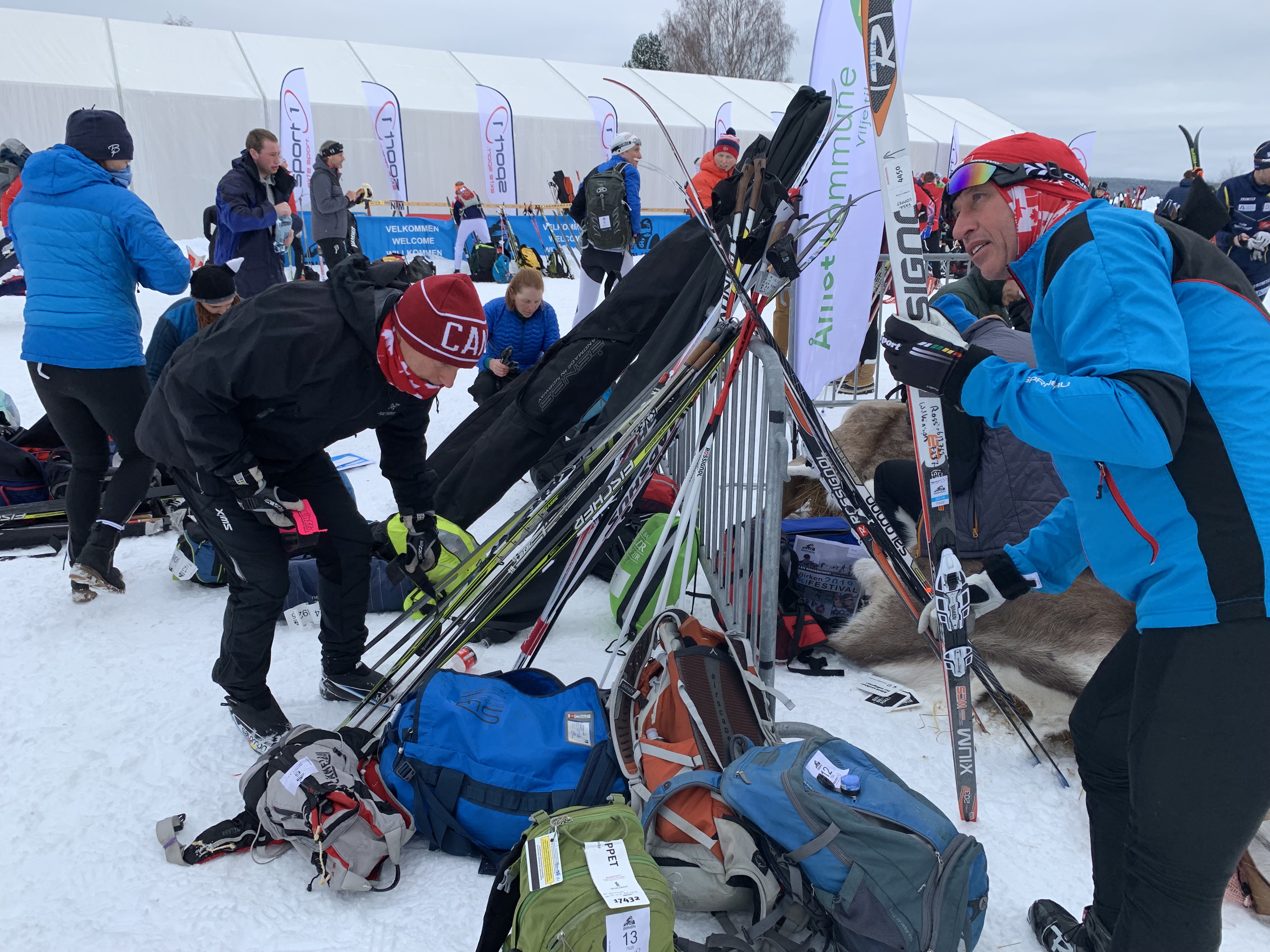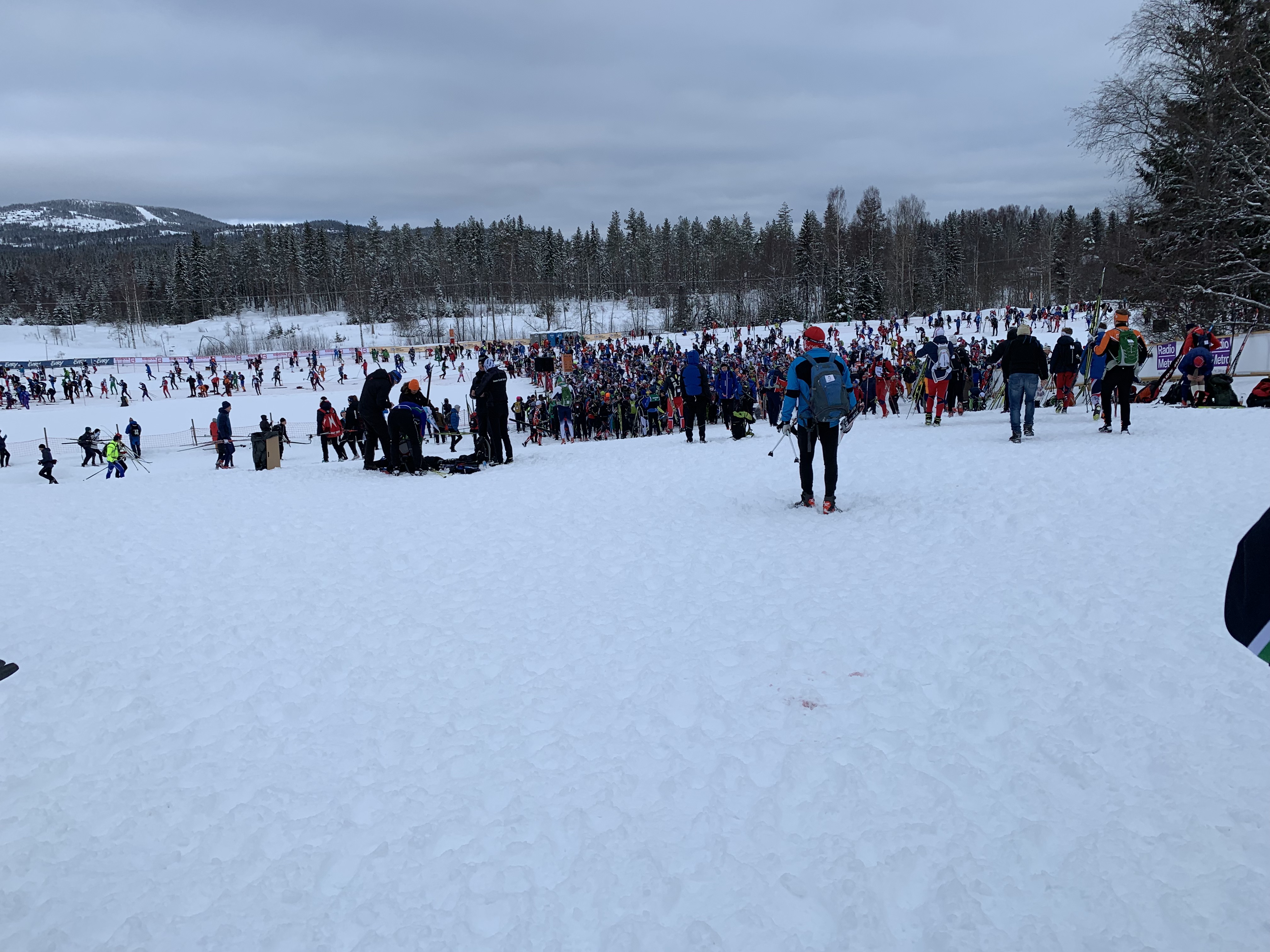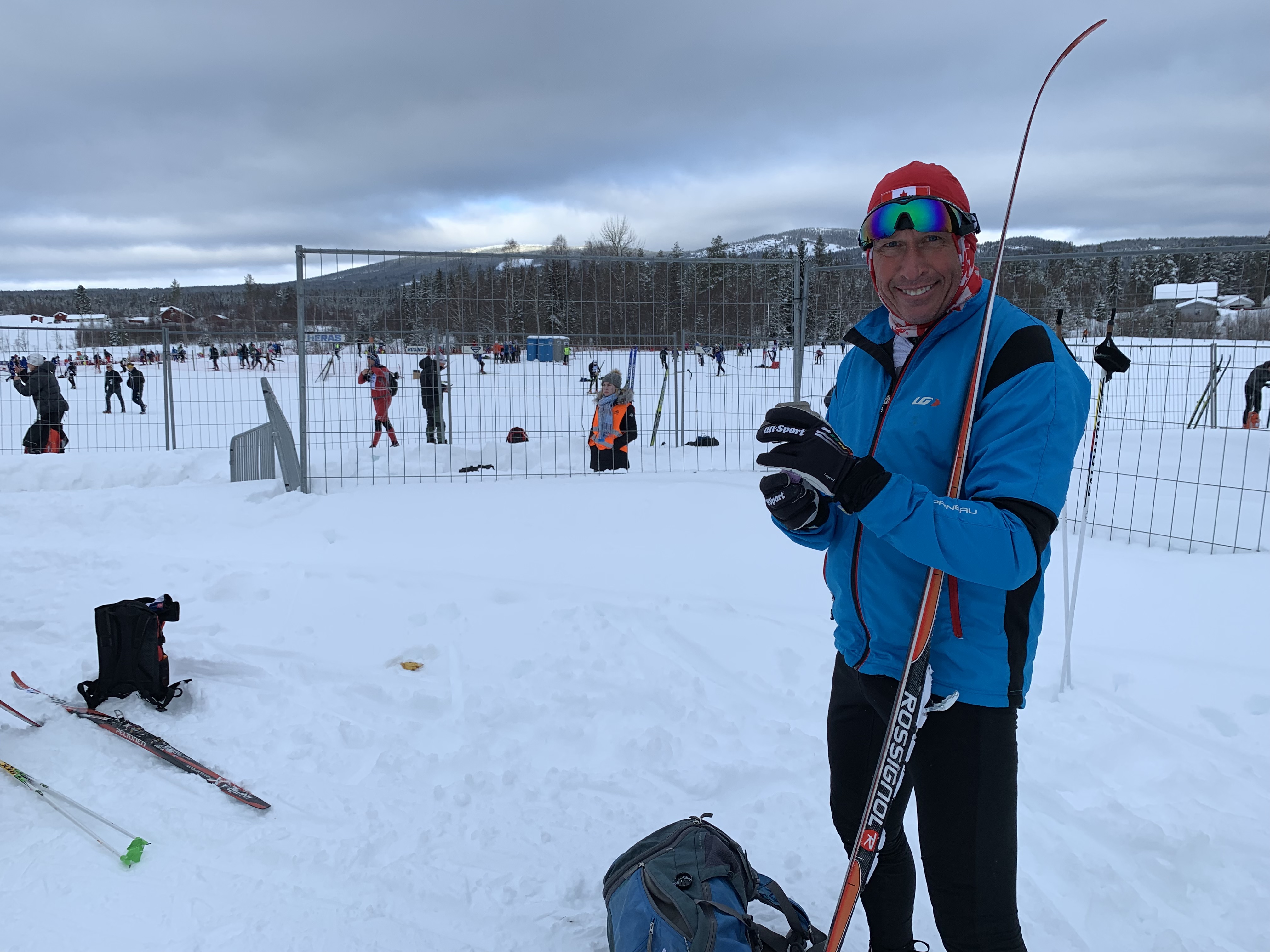 The start area is a busy place- about 12,000 skiers!Sitting on reindeer hides by the fire!Feeling no pressure:)!Ross walking over to the wax testing/warm-up area as the temperature is rising.We had to adjust our wax to get better grip! It was so great that there was a wax testing area/warm up area.It was a very well. organized start and the waves left exactly 10 minutes apart. Ross was in the wave in front of me. Paul, Dave and John started further back.Ross is right at the front of the wave at the start! He’s wearing a red hat and light green and white shirt.The start!I’m ready to go! Start is in 5 minutes!
