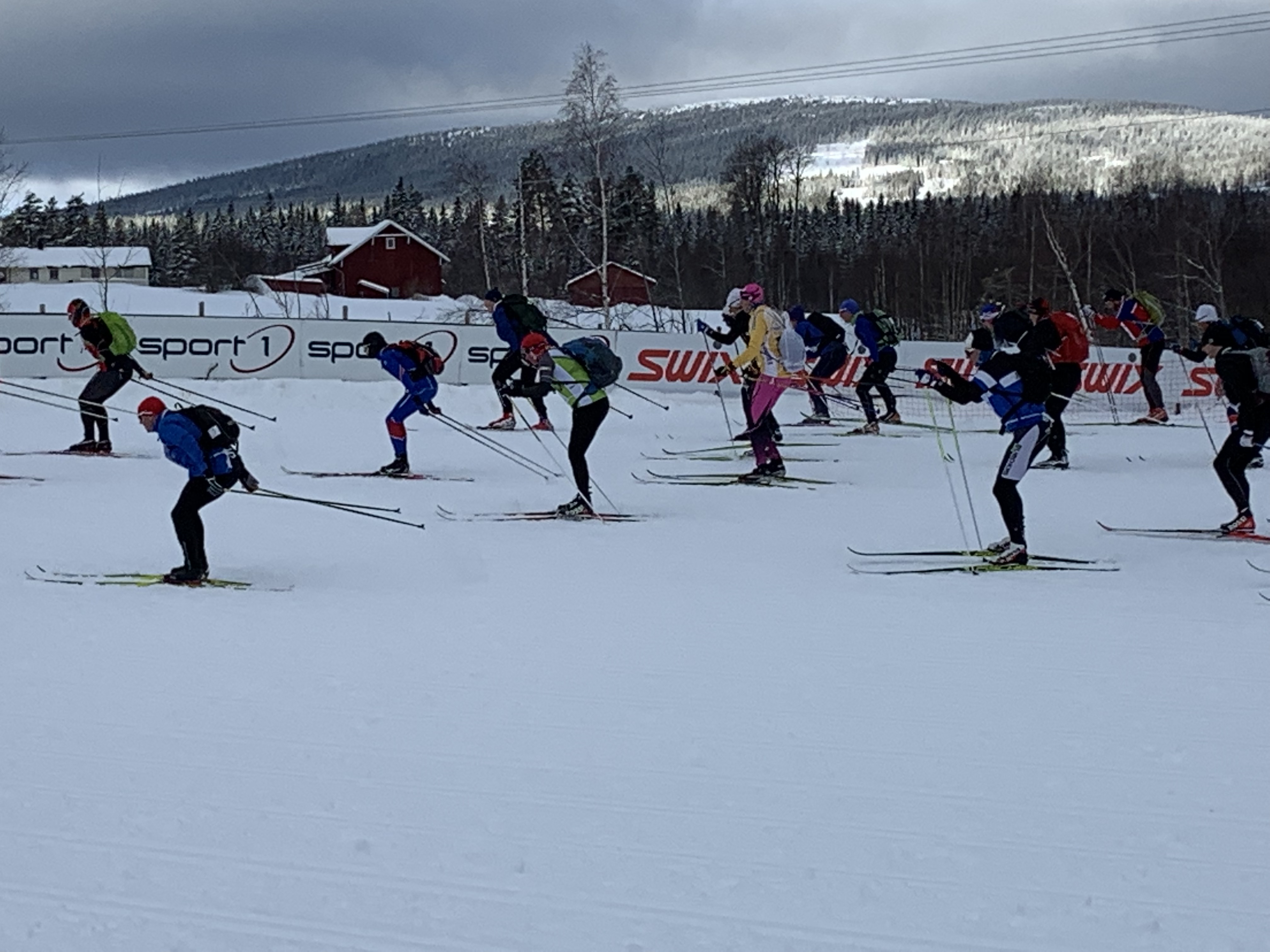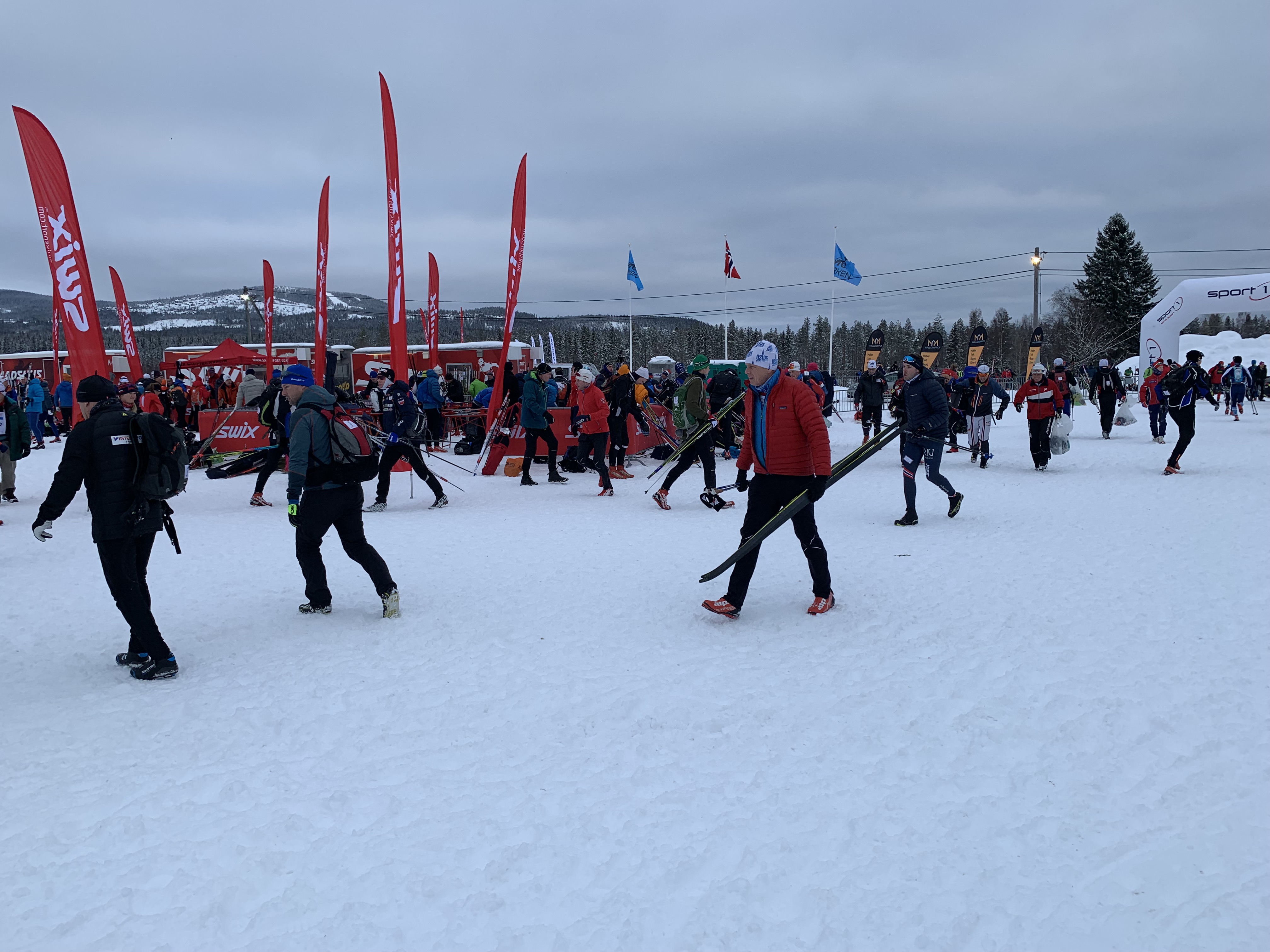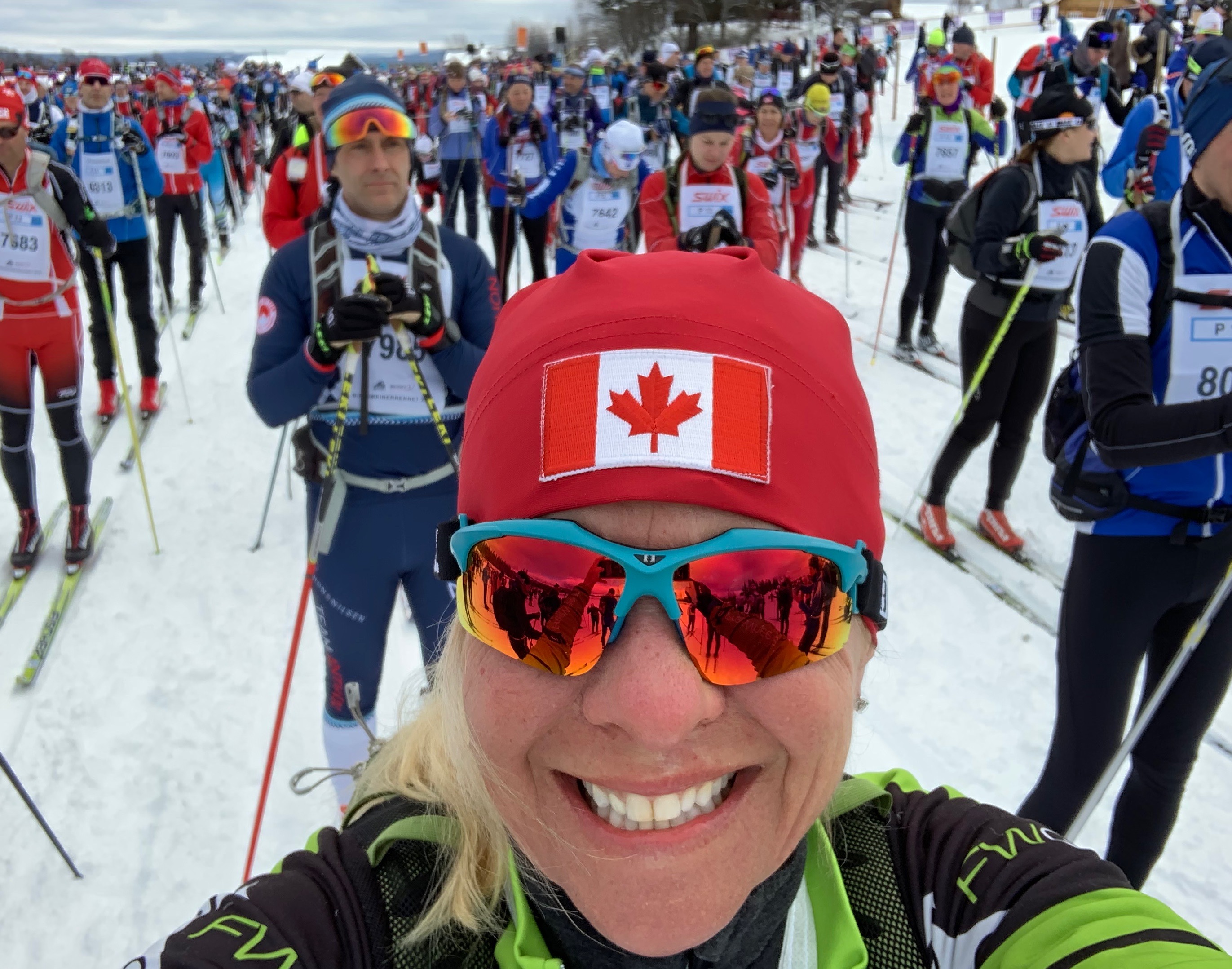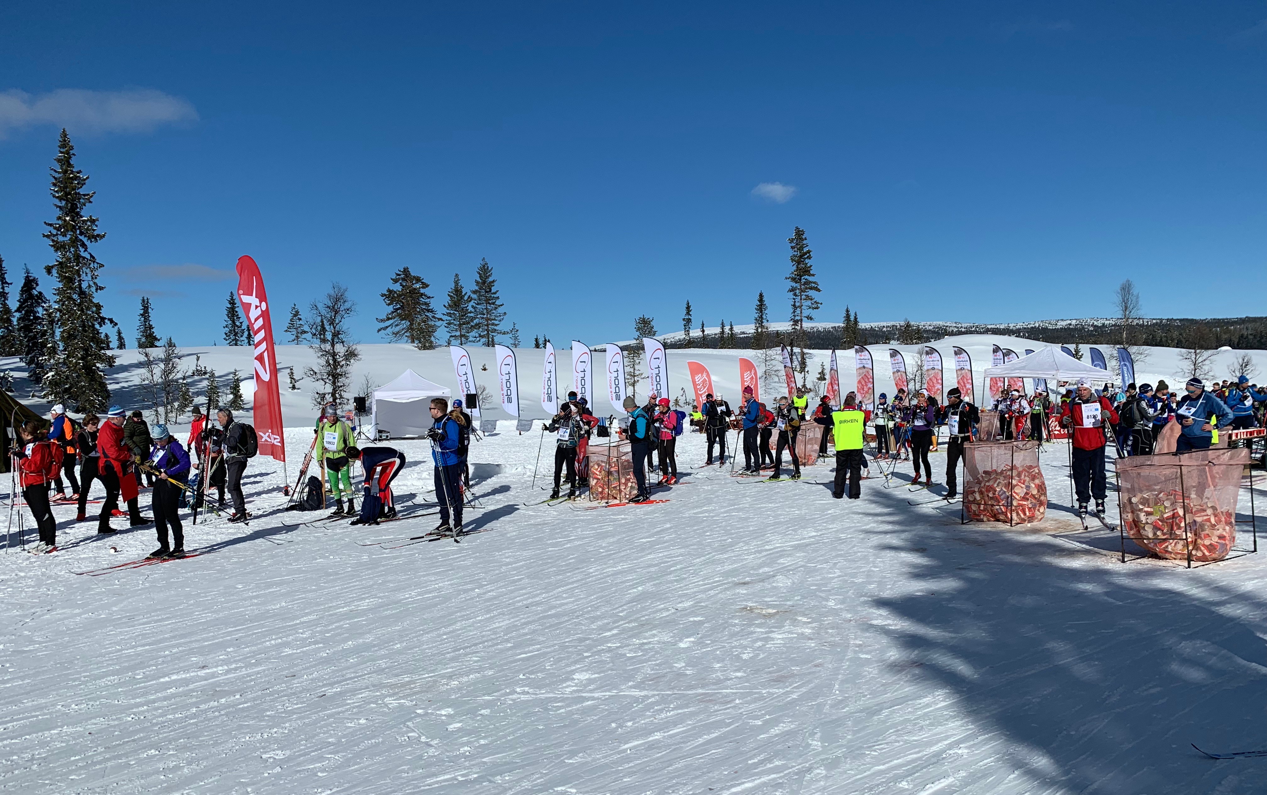 The start area is a busy place- about 12,000 skiers!Sitting on reindeer hides by the fire!Feeling no pressure:)!Ross walking over to the wax testing/warm-up area as the temperature is rising.We had to adjust our wax to get better grip! It was so great that there was a wax testing area/warm up area.It was a very well. organized start and the waves left exactly 10 minutes apart. Ross was in the wave in front of me. Paul, Dave and John started further back.Ross is right at the front of the wave at the start! He’s wearing a red hat and light green and white shirt.The start!I’m ready to go! Start is in 5 minutes!
