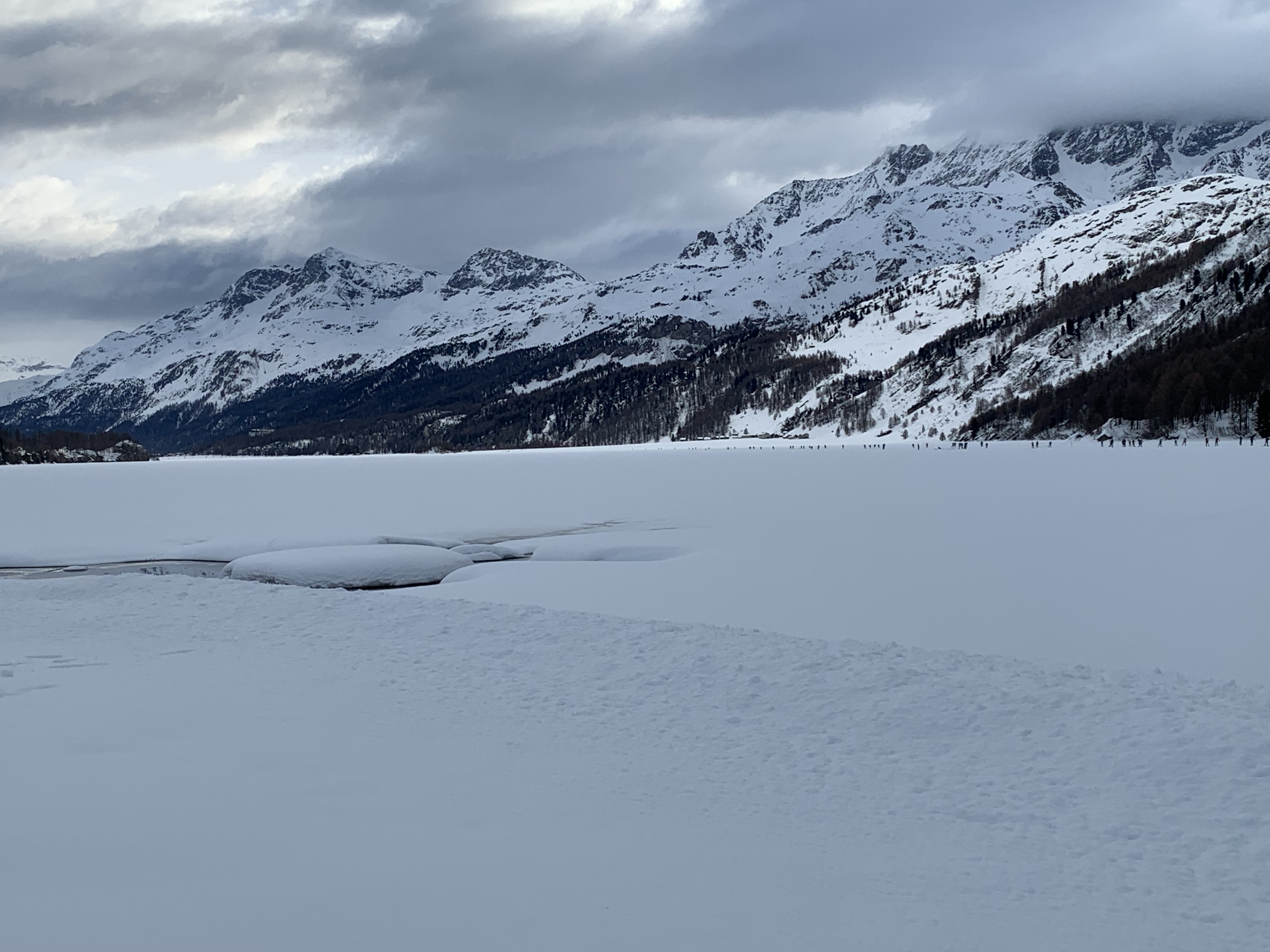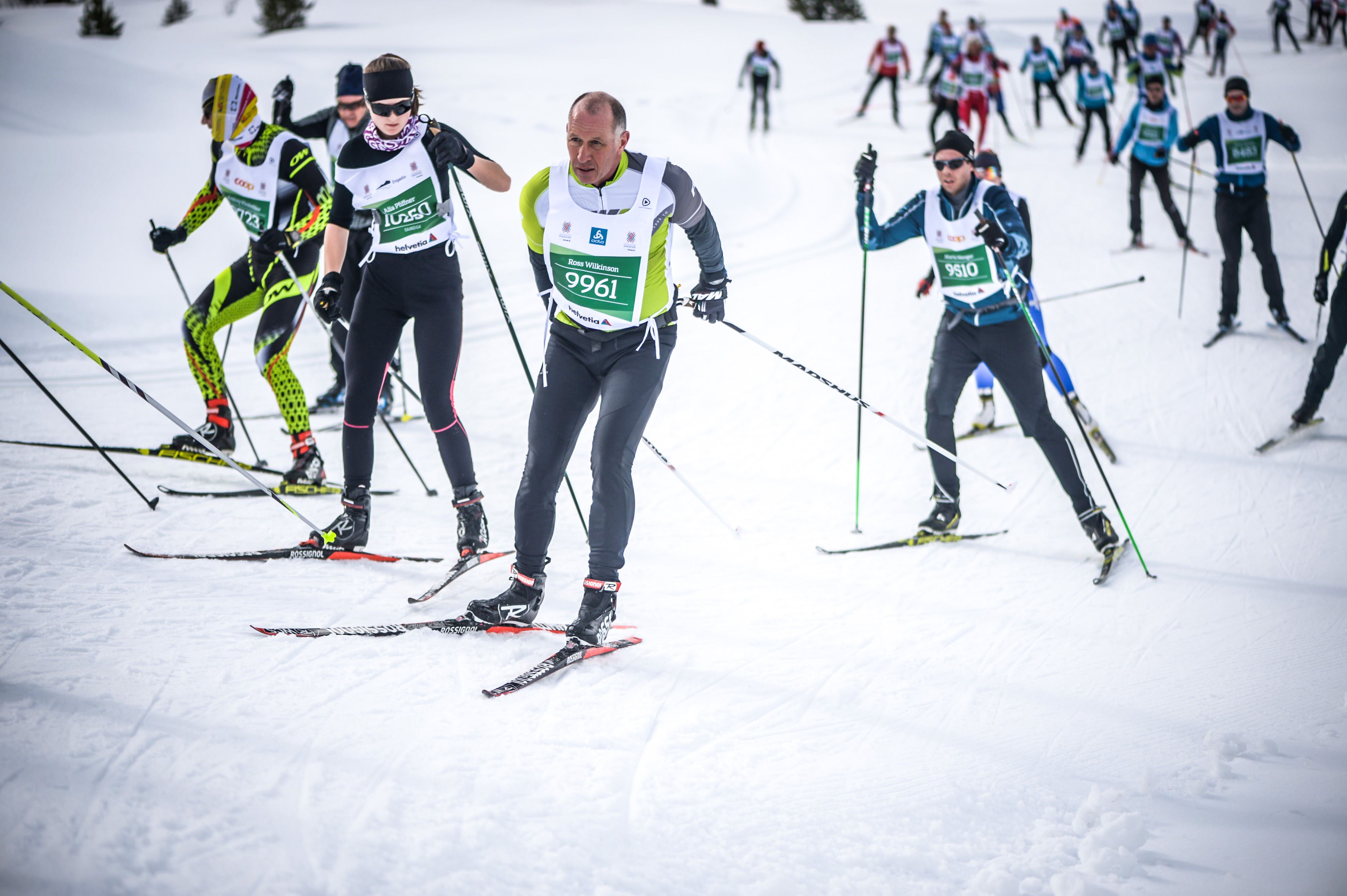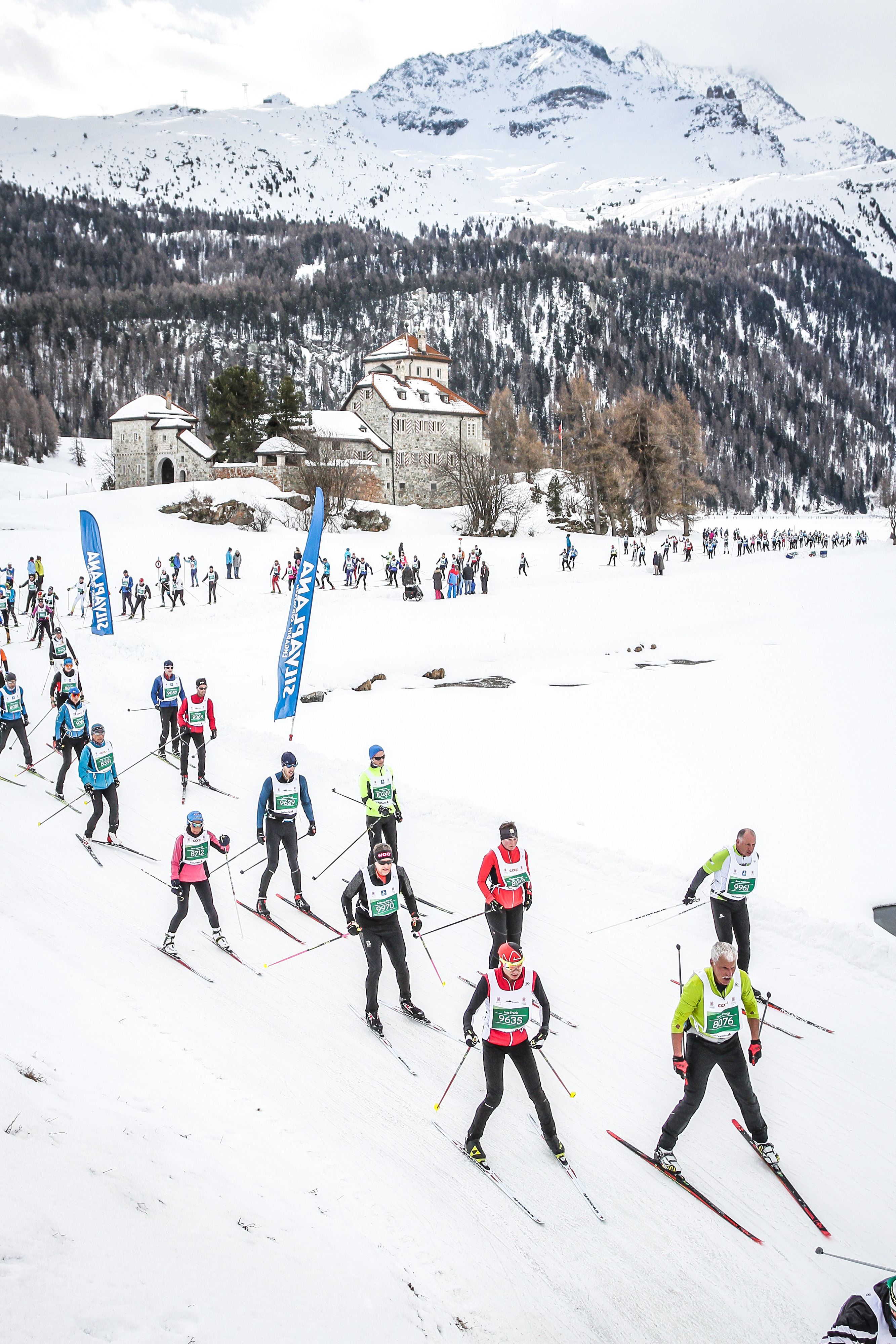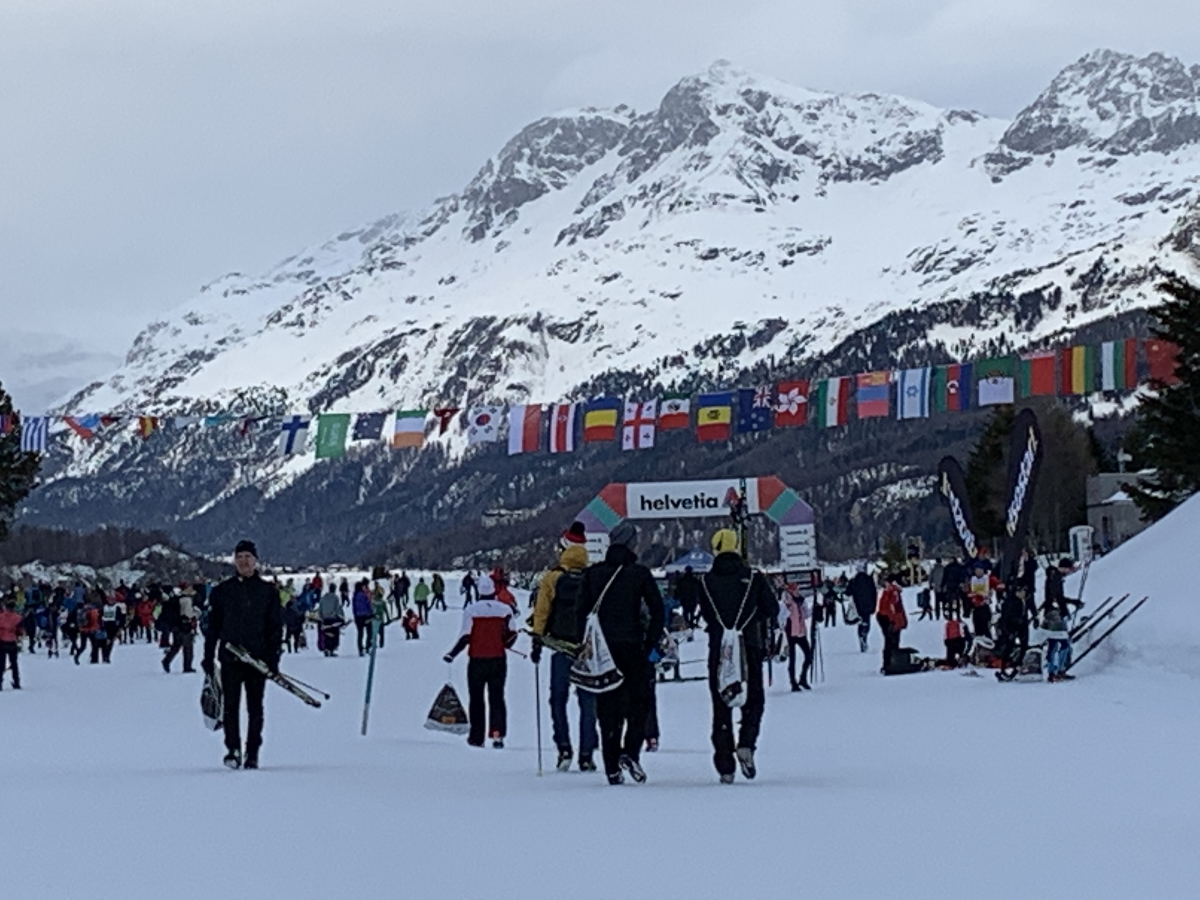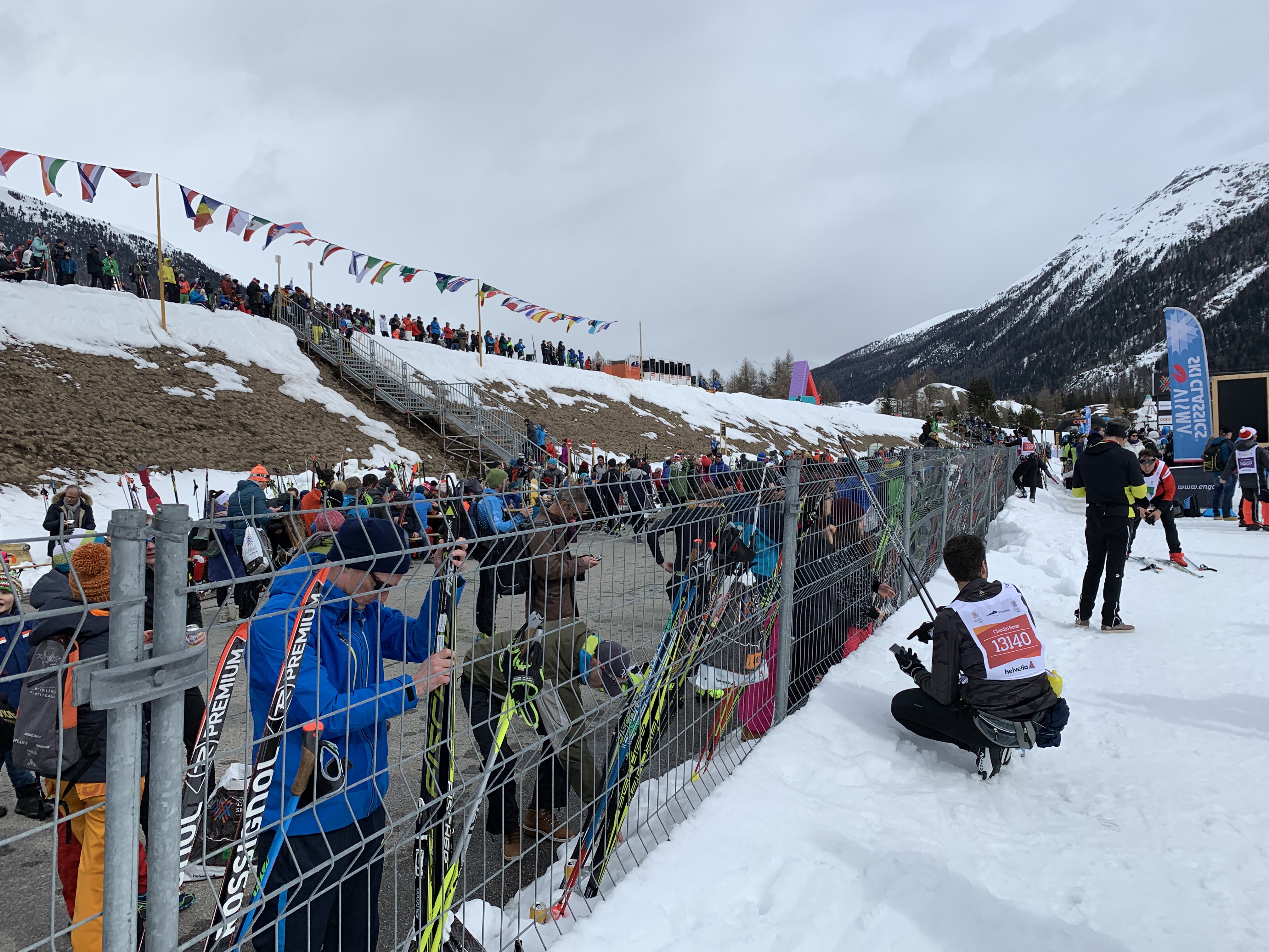Our hotel was serving breakfast at 6:15 which worked well for us to catch the 6:45 bus to the start in Maloja. Fortunately, the bus stopped right outside our hotel and man was it ever filled with skiers, standing room only. The start was so well organized; they even had the army and their trucks out to do the baggage transportation. We waited in the warming tent for a while before going to our “starting pens”. They used my first in my age group from the American Birkiebeiner Korteloppet last year to seed me so I was in the Elite C wave. I was nervous about starting up too close to the front so started at the very back of the wave which I won’t do again. It just means there are more people to pass, the next wave fast skiers are passing me which is psychologically tough and the track is more skied in. Ross didn’t ask for seeding and we figure they drew for the next waves so luckily he was only one wave behind me. I knew he’d pass me though- the questions was when!!